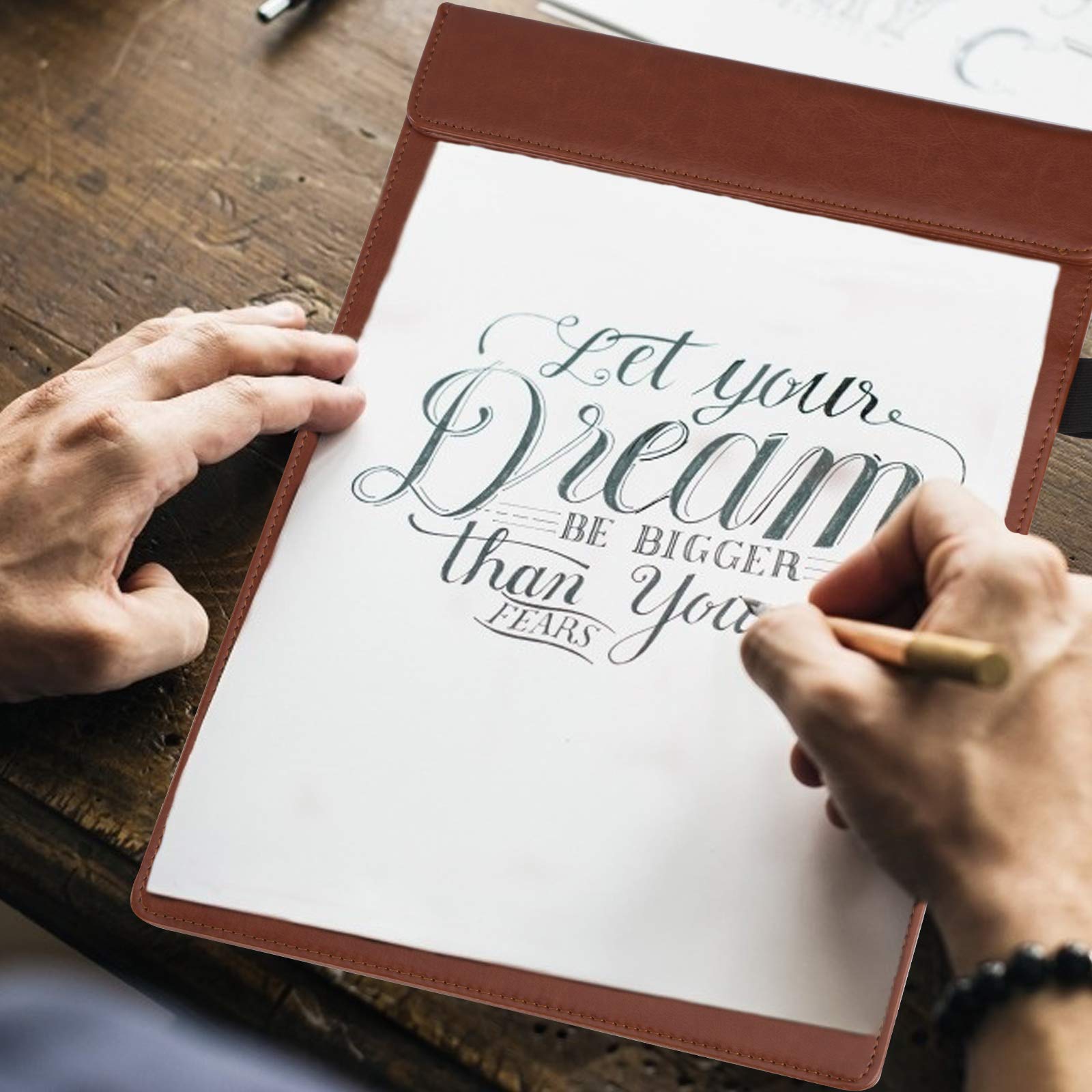Perfekt für Meetings und den Büroalltag! Dieses stylische A4-Klemmbrett aus robustem PU-Leder (23,5x34 cm) hat einen starken Magnetclip, der deine Papiere sicher festhält - ohne lästige Kratzer! Mit integriertem Stifthalter, damit dein Stift immer griffbereit ist. Super praktisch für Restaurantmitarbeiter, die Menüs oder Rechnungen sicher transportieren müssen. Ohne störende Logos - passt sich deinem Corporate Design an. Die klassische braune Farbe sieht professionell aus und ist für jeden Business-Anlass geeignet. Nylon-Faden-Nähten sorgen für extra Langlebigkeit. Einfach in die Aktentasche stecken und los geht's - ob im Café, im Meeting oder auf Geschäftsreise!
