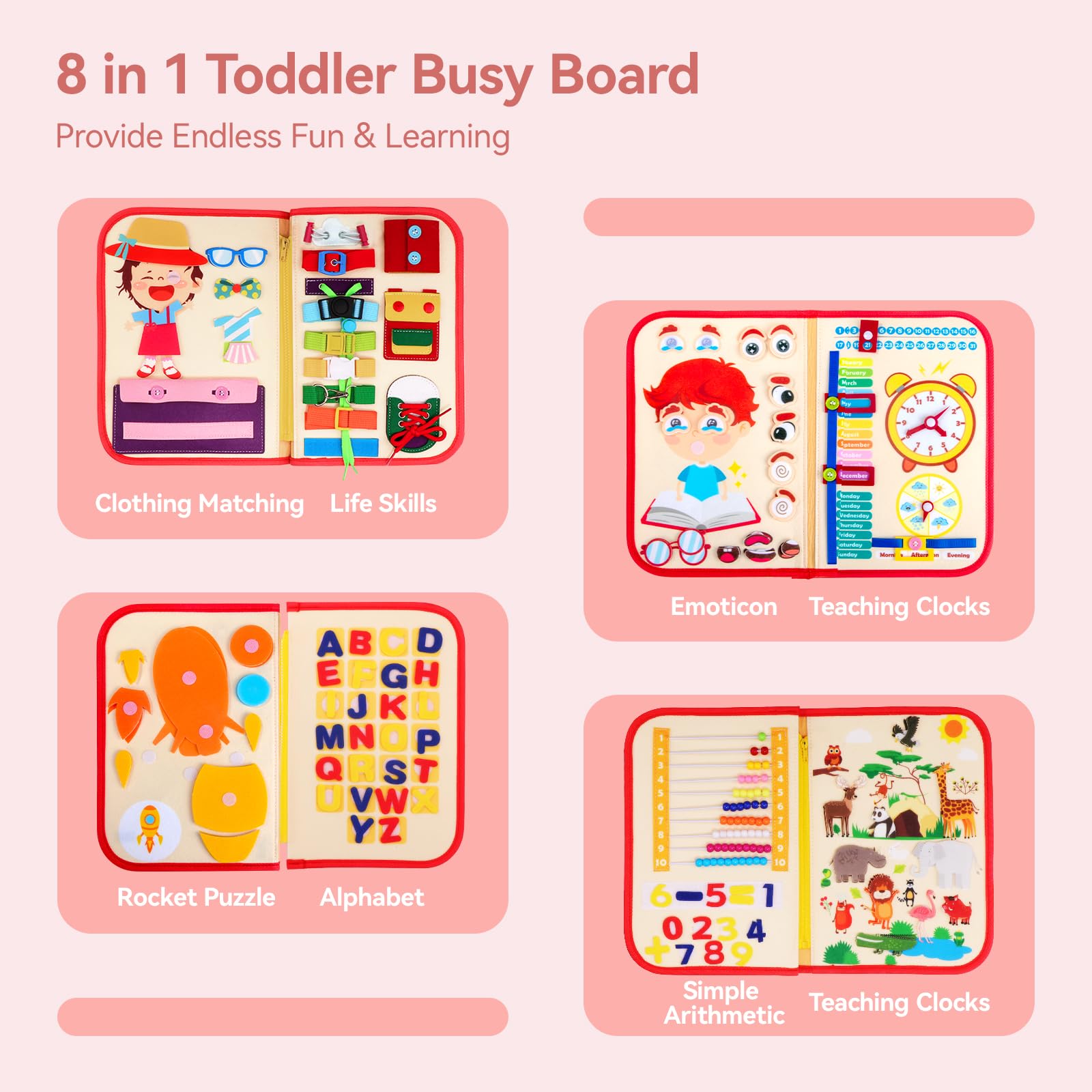 Boah, dieses Busy Board ist der Hit für kleine Entdecker! Mit 8 verschiedenen Aktivitäten auf 6 Seiten - da gibt's immer was Neues zu entdecken. Perfekt für Kinder ab 1 Jahr zum Ziehen, Schieben, Drehen und Fädeln. Fördert spielerisch die Feinmotorik und die Sinne. Super leicht mit nur 0,31kg - ideal für unterwegs im Auto, Flugzeug oder Restaurant. Aus robustem ABS-Kunststoff mit abgerundeten Ecken - absolut sicher für kleine Hände. Mit Tragegriffen - kann easy überall mitgenommen werden. Farbenfrohes Design begeistert die Kleinen. Auch toll für Kinder mit Autismus oder ADHS. Perfektes Geschenk zu Geburtstag oder Weihnachten! Einfach mal ausprobieren - dein Kind wird's lieben!