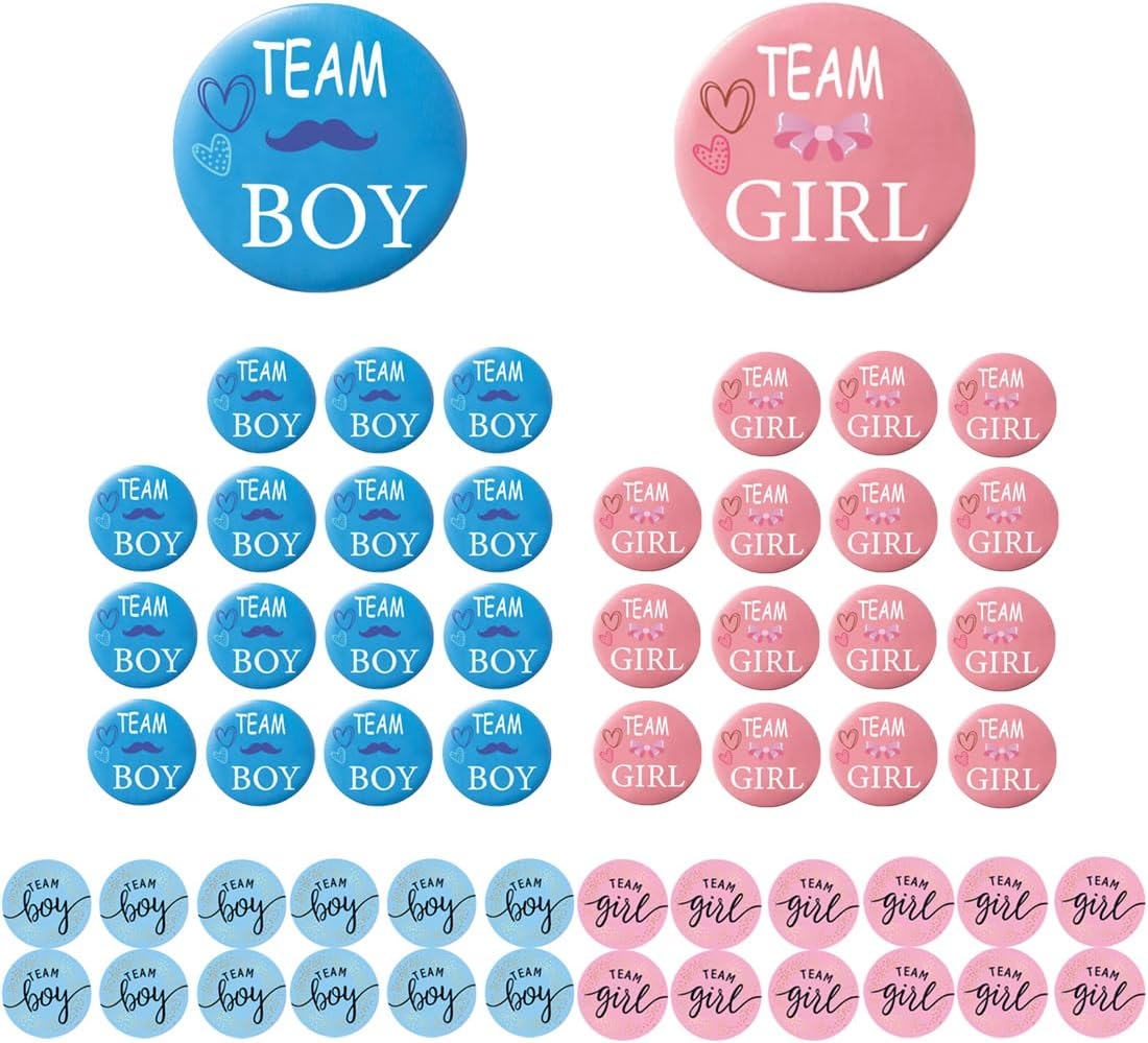 Mach deine Gender Reveal Party zum absoluten Highlight! Dieses Set mit 30 Buttons (15x Team Boy in Blau, 15x Team Girl in Rosa) bringt Stimmung in deine Baby Shower. Jeder Pin hat 4,3cm Durchmesser und ist aus hochwertigem ABS und Eisen mit goldener Prägung. Die abgerundeten Kanten sind super sicher für alle Gäste. Perfekt für Kleidung, Taschen oder als Deko für Tischkarten und Luftballons. Die rutschfeste Rückseite hält bombenfest, ohne etwas zu beschädigen. Wiederverwendbar und in stabiler OPP-Verpackung geliefert. Einfach anstecken und die Spannung steigern - wer wird es denn? Team Blau oder Team Rosa? Deine Gäste werden begeistert sein!