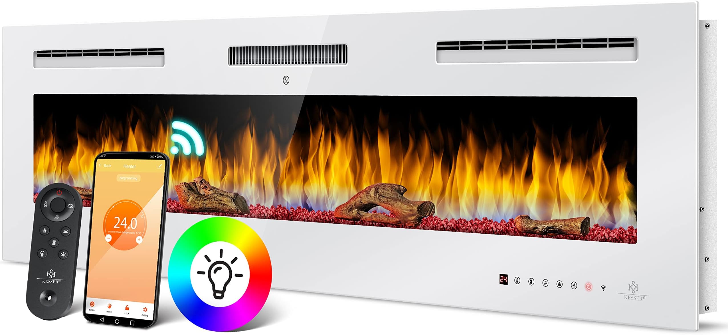 Der ultrarealistische LED-Flammeneffekt mit farbwechselnder Technologie sieht täuschend echt aus. Die Flammen-Intensität ist stufenlos regelbar, und im reinen Flammenmodus verbraucht der Kamin nur 10 Watt.