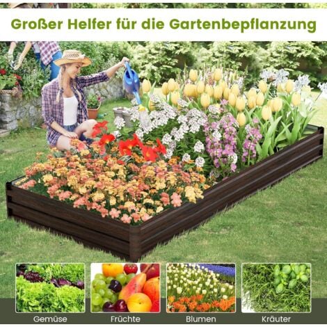Gärtnern mal anders - mit diesem praktischen Hochbeet von COSTWAY! Mit 120 x 61 x 25,5 cm bietet es genug Platz für Gemüse, Kräuter oder Blumen. Und das Beste: Du musst dich nicht mehr bücken!\n\nAus 100% natürlichem Fichtenholz gefertigt, sieht das Beet nicht nur super aus, sondern ist auch extrem stabil. Die 13 mm dicken Seitenwände halten dem Druck der Erde stand und die geschlitzten Beine sorgen für festen Stand.\n\nWarum dieses Hochbeet so praktisch ist:\n- Offener Boden für perfekte Drainage\n- Keine Staunässe, gesündere Pflanzen\n- Einfache Montage durch Stecksystem\n- 0,18 m³ Fassungsvermögen\n- Kann farblich angepasst werden\n\nPerfekt für Terrasse, Balkon oder Garten. Ob du Gemüse anbauen willst, frische Kräuter für die Küche oder einfach nur schöne Blumen - dieses Beet macht Gärtnern zum Kinderspiel.\n\nAuch für Anfänger ideal! Einfach aufstellen, mit Erde füllen und lospflanzen. Deine Pflanzen werden es dir mit üppigem Wachstum danken. Ökologisch, praktisch und einfach schön!