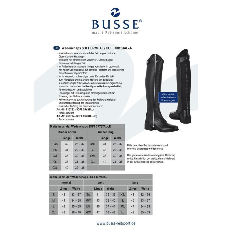 Glanzvoll reiten mit diesen BUSSE Wadenchaps! Die SOFT CRYSTAL Version begeistert mit einem seitlichen Dressurbogen der mit funkelnden Strasssteinen verziert ist - sorgt für ein optisch langes Bein. Anatomisch auf das Bein zugeschnitten für perfekten Close-Contact. Außen strapazierfähiges Kunstleder in Lederoptik mit hoher Dehnkapazität, innen weiches Fleecelining für optimalen Tragekomfort. Der YKK-Vislon-Reißverschluss läuft von unten nach oben und ist beidseitig elastisch eingearbeitet. Mit Lederriegel und Druckknopf zur Fixierung. Keileinsatz vorne deckt Jodhpurstiefeletten ab und polstert Sporenriemen. Elastischer Fußsteg mit Lederschoner. In Größe XL für Weite 36-40 und Höhe 48. Einfach anziehen und glänzen!