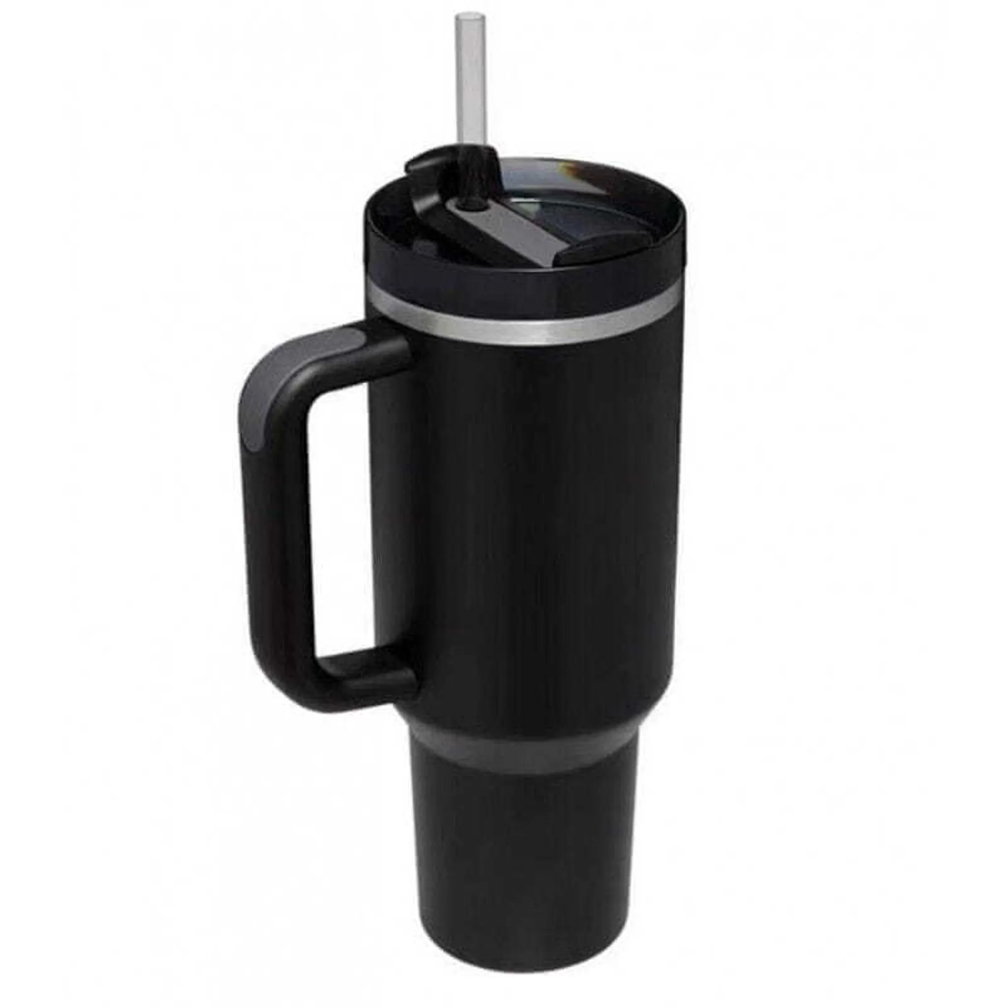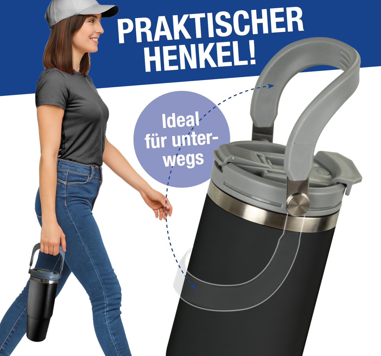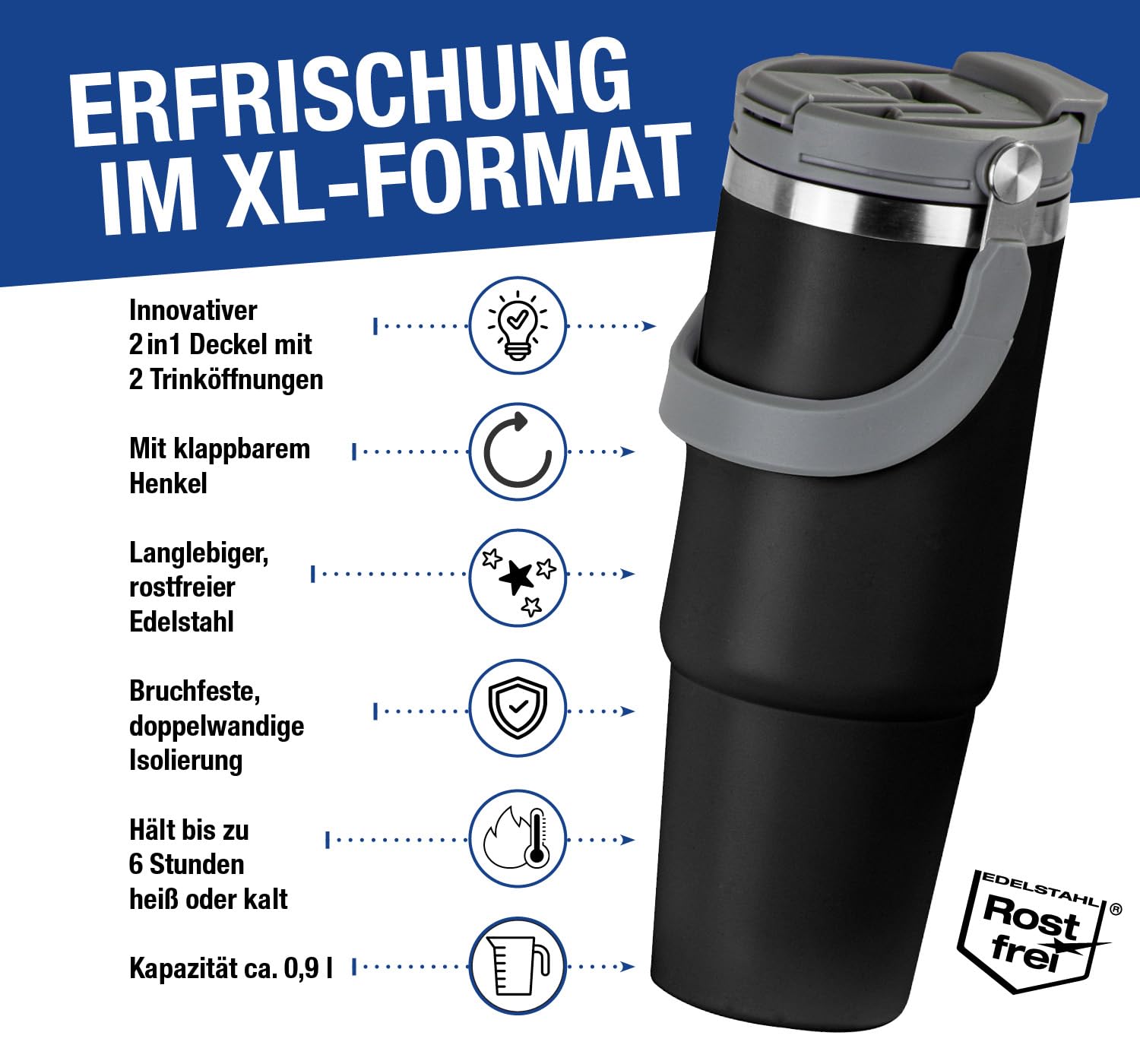 CUCINOVA Thermobecher 900ml Schwarz - Trinkflasche Mit Henkel & Strohhalm