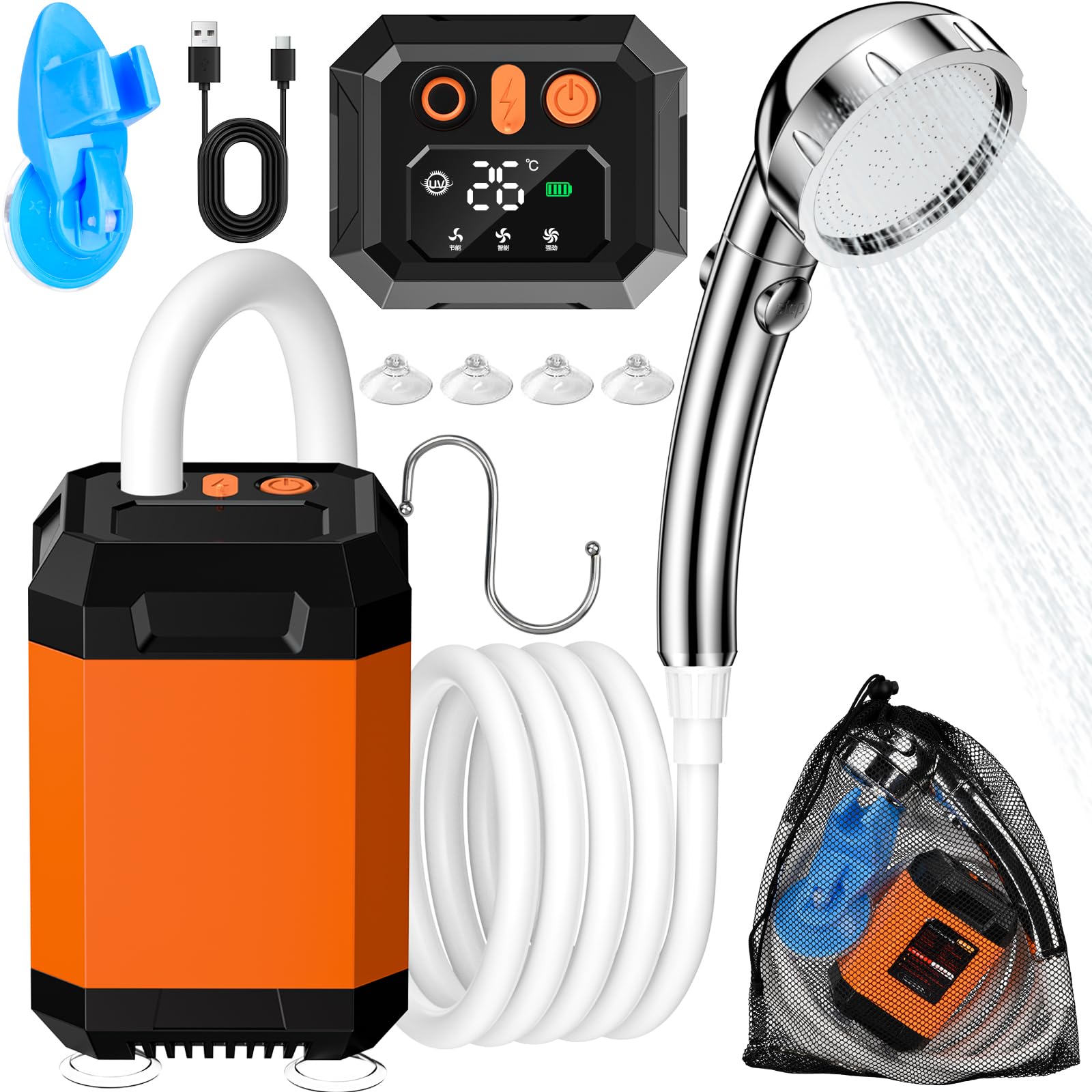 Endlich eine praktische Dusche für unterwegs! Die BORDEAG Campingdusche hat einen starken 6000mAh Akku, der bis zu 150 Minuten durchhält - perfekt für Camping, Strandtage oder einfach für den Garten. Mit dem digitalen Display siehst du immer die Wassertemperatur und den Akkustand. Die 5 Gänge geben dir die volle Kontrolle über den Wasserstrahl, von sanft bis kräftig. Und das Beste: Mit Halter, Saugnäpfen und Haken kannst du handsfree duschen! Der 5-Gallonen-Eimer ist leicht zu tragen und bietet genug Wasser für eine erfrischende Dusche. Ob nach dem Schwimmen, beim Autowaschen oder für deine Haustiere - diese Dusche ist dein vielseitiger Begleiter. Alles dabei, was du brauchst - einfach aufladen und los geht's!