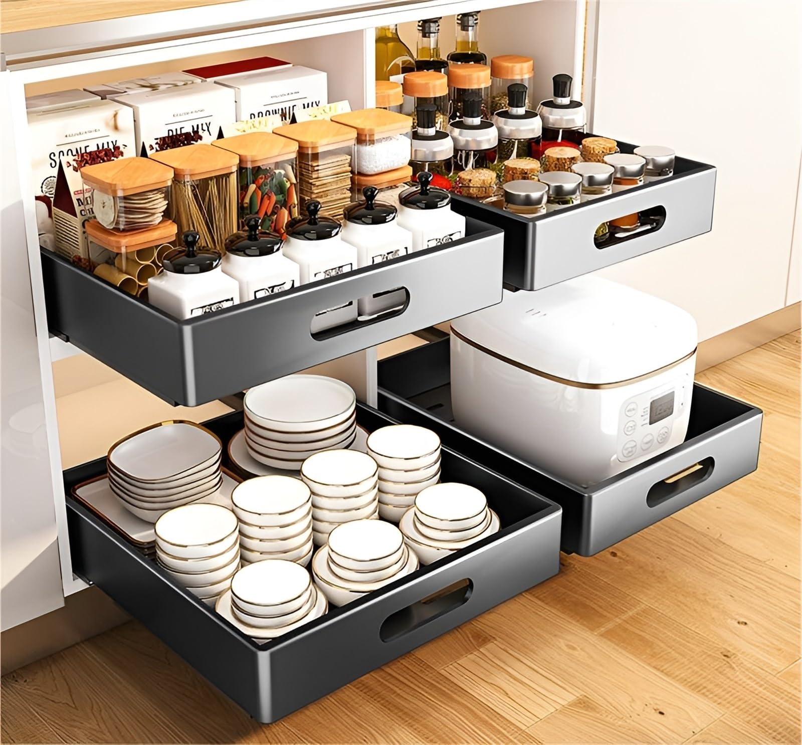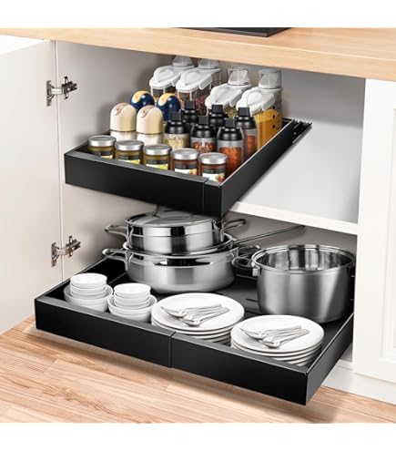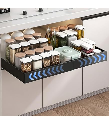 Endlich Ordnung in deinen Küchenschränken! Dieses praktische 2-teilige Set mit ausziehbaren Schubladen-Organizern bringt System in deine Aufbewahrung. Die große Schublade hat eine Tiefe von 41 cm, Höhe 8 cm und verstellbare Breite von 32-52 cm. Die kleine Variante ist 39 cm tief, 8 cm hoch und passt sich von 31-50 cm Breite an. Perfekt für rahmenlose Schränke mit mindestens 33 cm Breite und 42 cm Tiefe. Die Installation ist super einfach: Entweder mit den mitgelieferten Nano-Klebestreifen (kein Bohren nötig!) oder optional mit Schrauben für extra Stabilität. Die 3 Gleitschienen mit Dämpfung sorgen für leises und sanftes Ausziehen - selbst bei voller Belastung bis 25 kg! Aus robustem Kohlenstoffstahl gefertigt, rostfrei und leicht zu reinigen. Ideal für Töpfe, Pfannen, Vorräte oder Putzmittel. Hol dir endlich den Überblick über deine Küchenutensilien und mach das Suchen nach dem richtigen Topf zur Vergangenheit!