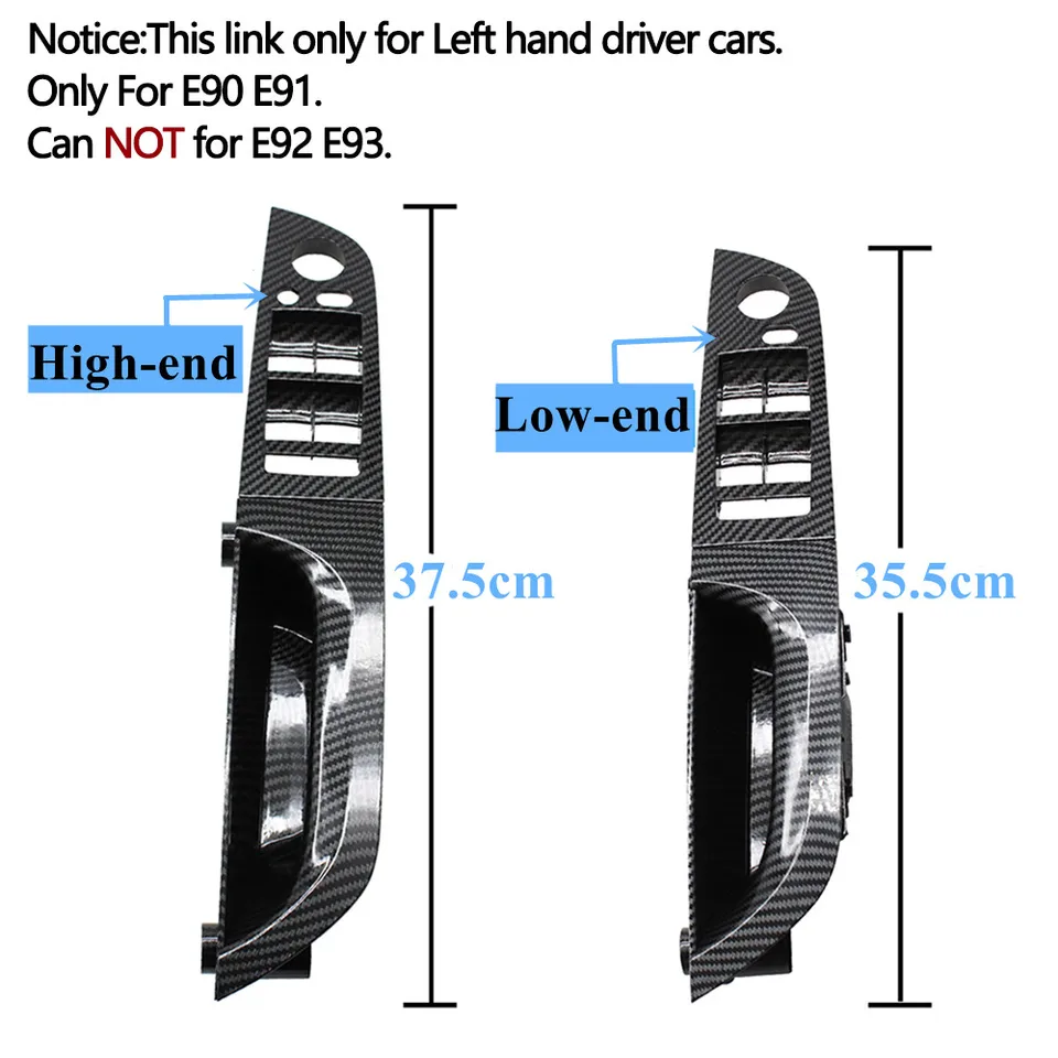 Upgrade deinen BMW Innenraum! Diese Türgriffabdeckungen im Carbon-Look passen perfekt für die 3er Reihe E90, E91 und E92. Aus hochwertigem ABS+PC Material, UV-beständig und kratzfest. Einfach zu montieren - einfach über die originalen Griffe clipsen, kein Kleber nötigt! Schützt vor Abnutzung und verleiht dem Innenraum einen sportlichen Look. Für Links- und Rechtslenker geeignet. Hol dir den Race-Car-Look für deinen Daily Driver!