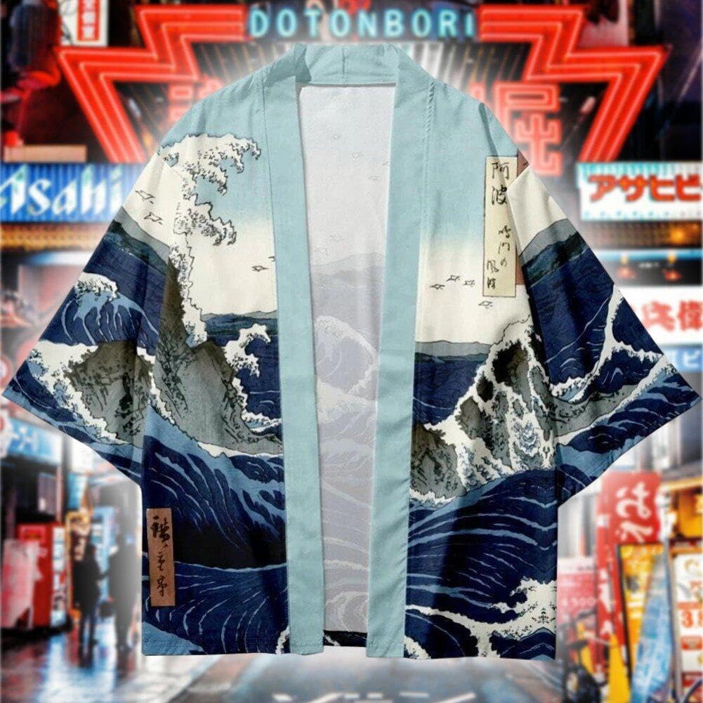Fühl dich wie im japanischen Sommer! Dieser stylische Kimono-Cardigan im Insel-Wellen-Design ist perfekt für warme Tage. Aus leichtem Polyester gefertigt, liegt er angenehm auf der Haut ohne zu drücken. Mit 67cm Schulterbreite und 138cm Brustumfang passt er den meisten Männern und Jungen. Die 80cm Länge und 38,5cm Ärmel geben dir genug Stoff für lässigen Komfort. Super vielseitig kombinierbar - über T-Shirts, zu Shorts oder Hosen. Ob als Bademantel, für Cosplay, Strandtage, Festivals oder einfach nur zum Chillen zu Hause - dieser Kimono macht immer was her! Das offene Vorderseiten-Design gibt dir maximale Bewegungsfreiheit. Ein ideales Geschenk für Freunde, Partner, Väter oder Söhne, die was Besonderes suchen. Bring japanisches Flair in deinen Alltag!