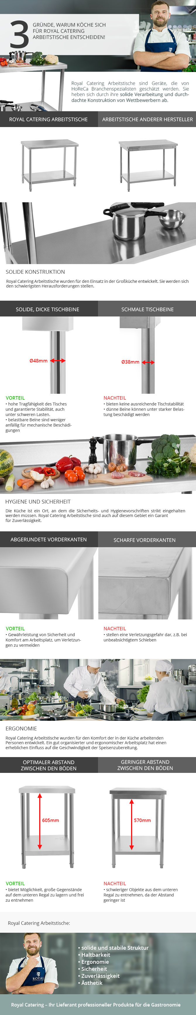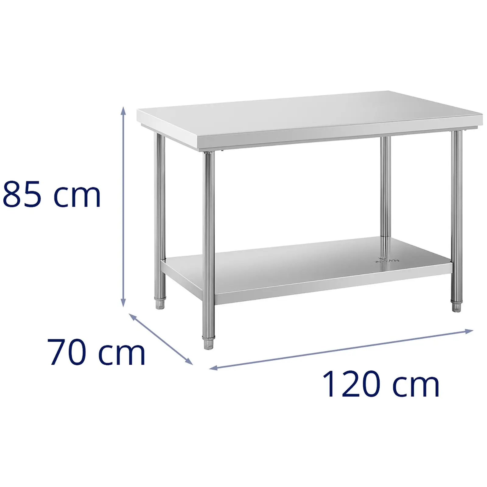 Professioneller Edelstahl-Tisch für Küche, Werkstatt oder Garage! Dieser Royal Catering Tisch ist ein echter Alleskönner. 🏭✨\n\nMit 120x70cm Arbeitsfläche und zwei zusätzlichen Ablagen hast du jede Menge Platz. Insgesamt trägt der Tisch satte 500kg - da kannst du wirklich alles draufstellen!\n\nDie höhenverstellbaren Füße sorgen auch auf unebenen Böden für perfekten Stand. Und die dicken 4,8cm Tischbeine geben extreme Stabilität.\n\nEdelstahl ist nicht nur hygienisch und pflegeleicht, sondern auch super langlebig. Einfach abwischen und der Tisch sieht aus wie neu.\n\nMontage ist kein Problem - alles dabei inklusive Anleitung. Perfekt für Gastronomie, Werkstätten, Hobbyräume oder als robuste Werkbank.\n\nInvestiere in Qualität, die jahrelang hält! 💪