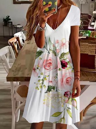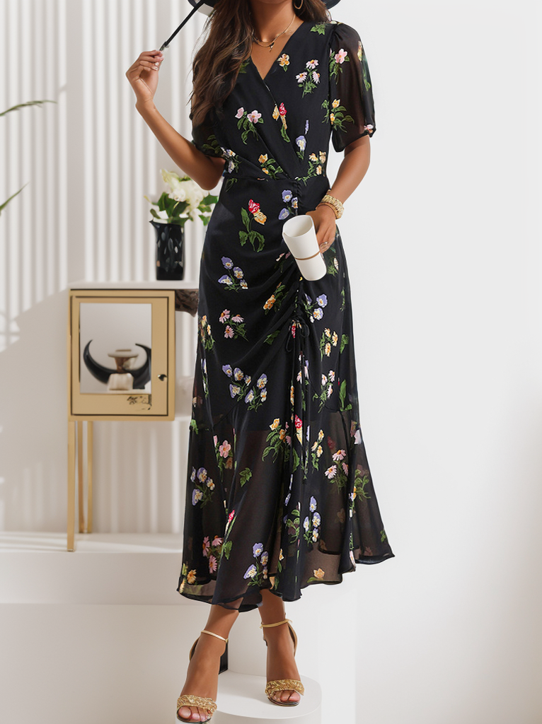Der V-Ausschnitt ist dezent und schmeichelhaft, die kurzen Ärmel sorgen für Bewegungsfreiheit. Die A-Linie passt zu fast jeder Figur und die Raffungen geben dem Kleid einen romantischen Touch. Einfach anziehen und du fühlst dich wie im Urlaub.