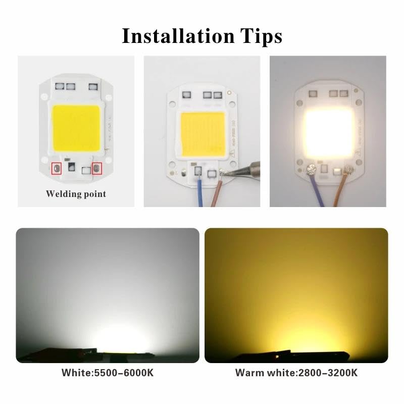 Richtig hell und super effizient! Dieser COB LED Chip mit 50W Leistung bringt professionelle Beleuchtung in deinen Garten, deine Garage oder auf die Terrasse. Direkt für 220V Anschluss geeignet - kein separates Netzteil nötig! Die integrierte Smart IC-Treiber-Technologie sorgt für hohe Energieeffizienz und lange Lebensdauer. Das Gehäuse aus Aluminiumlegierung leitet die Wärme optimal ab, sodass der Chip auch bei Dauerbetrieb kühl bleibt. Mit warmweißem Licht schaffst du eine gemütliche Atmosphäre und hast trotzdem maximale Helligkeit. Einfach zu installieren - perfekt zum Austauschen alter Halogen-Strahler oder für neue DIY Beleuchtungsprojekte. Vor dem Kauf unbedingt Spannung und gewünschte Leistung prüfen, dann steht perfekter Ausleuchtung nichts mehr im Weg!