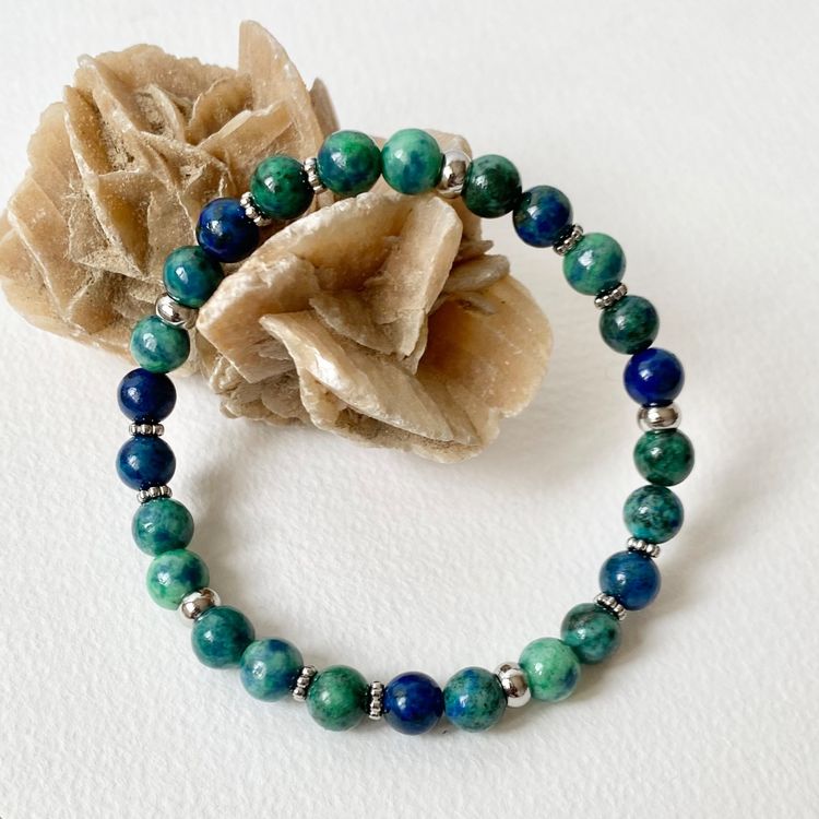 Entdecken Sie die kraftvolle Welt der Heilsteine mit diesem handgefertigten Chrysokoll Armband von Tenglang. Jede Perle wurde sorgfältig ausgewählt und zu einem einzigartigen Schmuckstück verarbeitet, das nicht nur gut aussieht, sondern auch Ihr Wohlbefinden unterstützen soll.