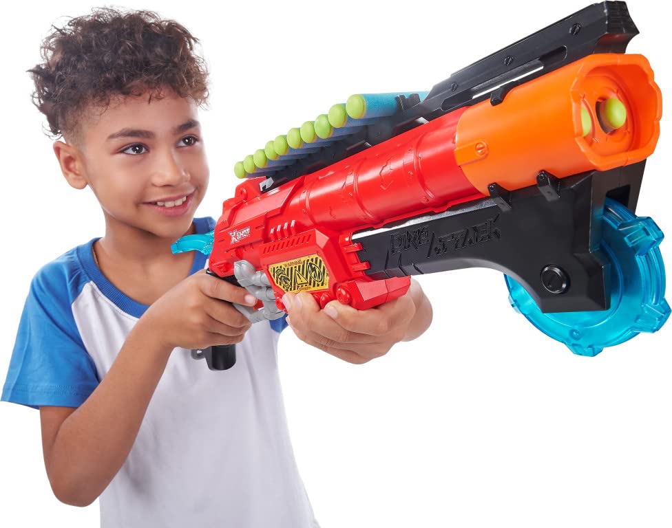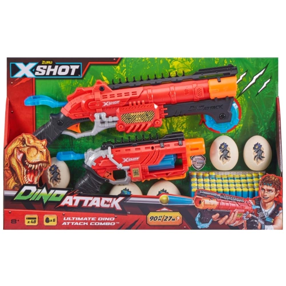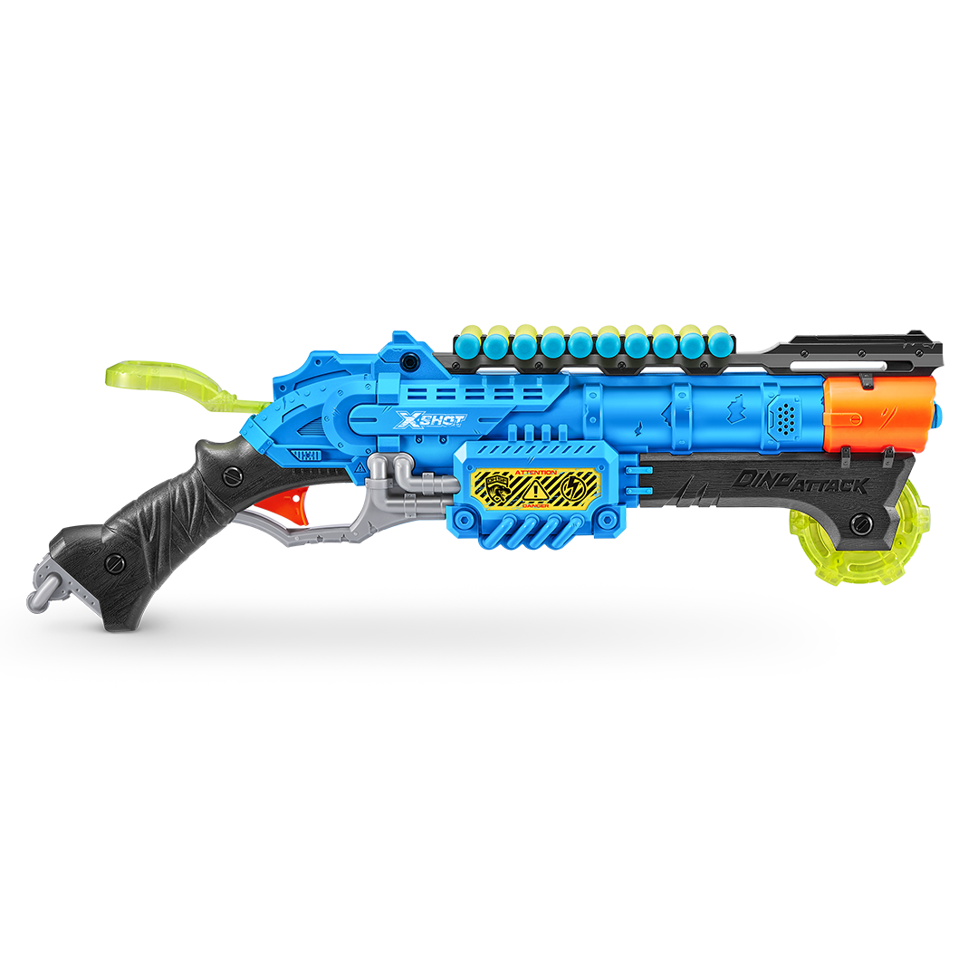 Achtung, Dino-Alarm! Mit dem X-Shot Claw Hunter jagst du die fiesen Dino-Eier, bevor sie schlüpfen. Der coole Blaster im Schrotflinten-Look hat Platz für 2 Darts direkt im Lauf und nochmal 10 im Magazin - da kommt richtig was zusammen! In der Packung findest du alles, was du für den Dino-Abwehr-Einsatz brauchst: 2 mittlere Dino-Eier, 4 kleine Dino-Eier und volle 24 Darts. Die Darts sind aus weichem Schaumstoff und damit super ungefährlich. Die Eier kannst du zusammenstecken und dann aus bis zu 27 Metern Entfernung abknallen - volle Power! Der Blaster liegt gut in der Hand und macht richtig Spaß. Perfekt für Kindergeburtstage, Garten-Schlachten oder einfach nur zum Rumblödeln mit Freunden. Aber passt auf: Nicht für Kinder unter 3 Jahren geeignet wegen verschluckbarer Kleinteile! Für alle ab 6 Jahren ist das Dino-Abenteuer aber ein riesiger Spaß. Batterien brauchst du keine - einfach laden und feuern!