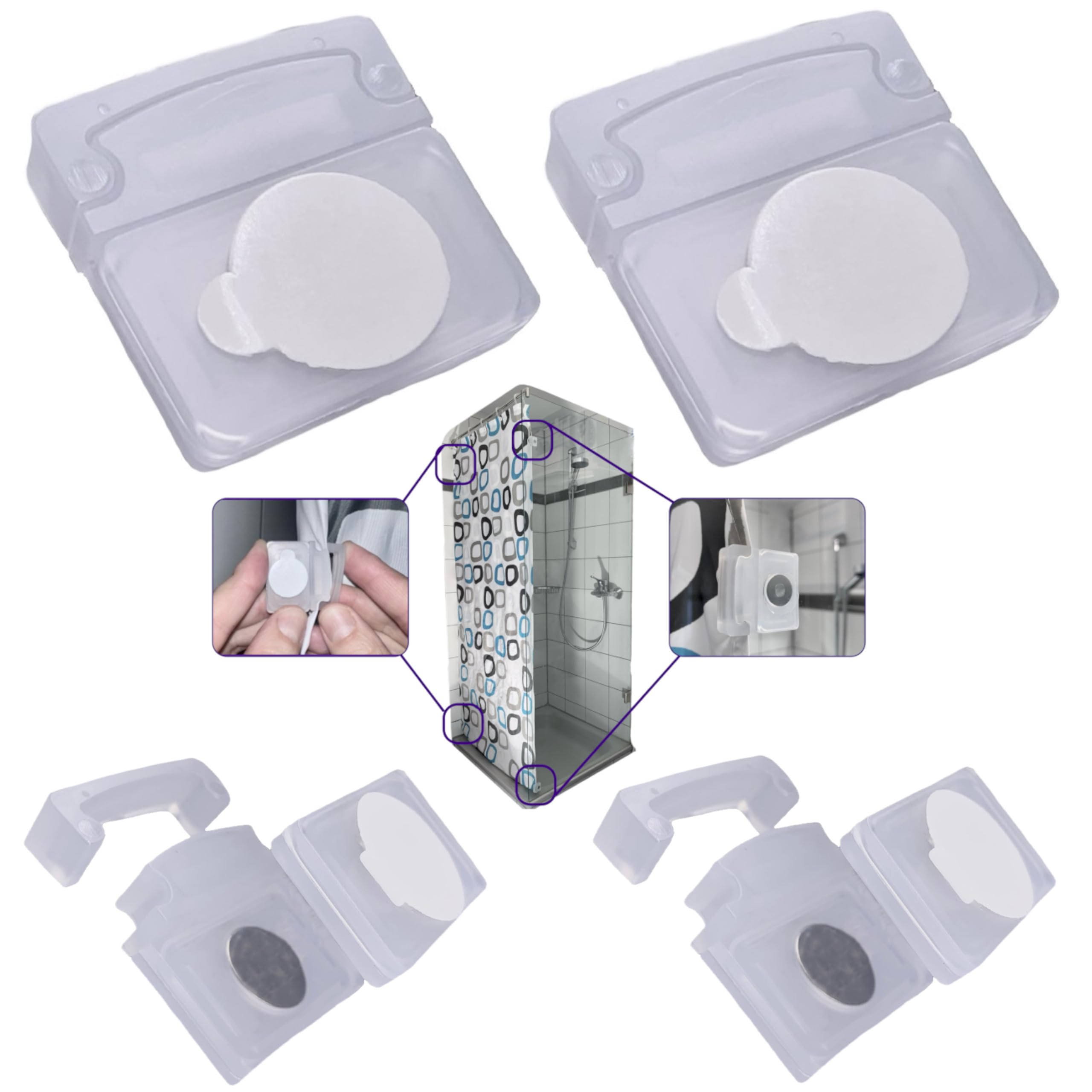 Schluss mit flatternden Duschvorhängen! Diese 4 praktischen Clips mit Krokodil-Klemme halten deinen Vorhang sicher an der Wand - ganz ohne Bohren. Einfach das Klebeband abziehen, festdrücken, fertig! Super fürs Badezimmer, aber auch im Camper, Wohnwagen oder für Gardinen. Das weiße Design ist dezent und passt überall hin. Aus robustem ABS-Kunststoff, also nichts rostet! Endlich keine nassen Badezimmerböden mehr. Einfach. Clever. Praktisch.