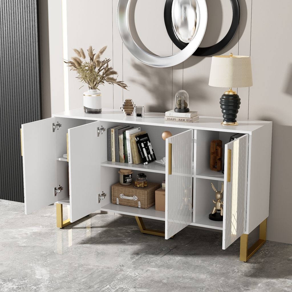 Stylisches Sideboard mit viel Stauraum! Mit 160 cm Breite, 80 cm Höhe und 40 cm Tiefe bietet dieses Möbelstück reichlich Platz für Geschirr, Deko oder Haushaltsutensilien. Die vier Türen mit Soft-Close-Scharnieren schließen sanft und leise. Die goldenen, gebürsteten Griffe und die hochglänzenden Tischbeine verleihen dem Sideboard einen modernen Look. Die integrierten Regalböden sind höhenverstellbar – so passt sich der Innenraum deinen Bedürfnissen an. Perfekt für Wohnzimmer, Schlafzimmer oder Flur. Ein echter Hingucker mit praktischem Nutzen!
