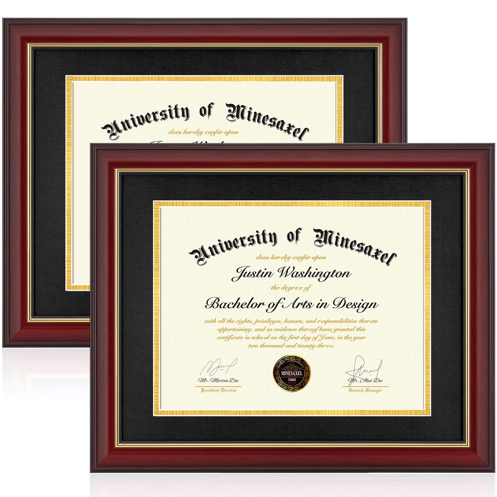 Deine Urkunden und Bilder verdienen den perfekten Rahmen! Der Minesaxel Diplomrahmen in schickem Kirschrot mit schwarzer Matte macht jede Auszeichnung zum Hingucker. Mit der Matte passt er perfekt für 36x43 cm Dokumente, ohne Matte sogar für 41x51 cm Bilder.