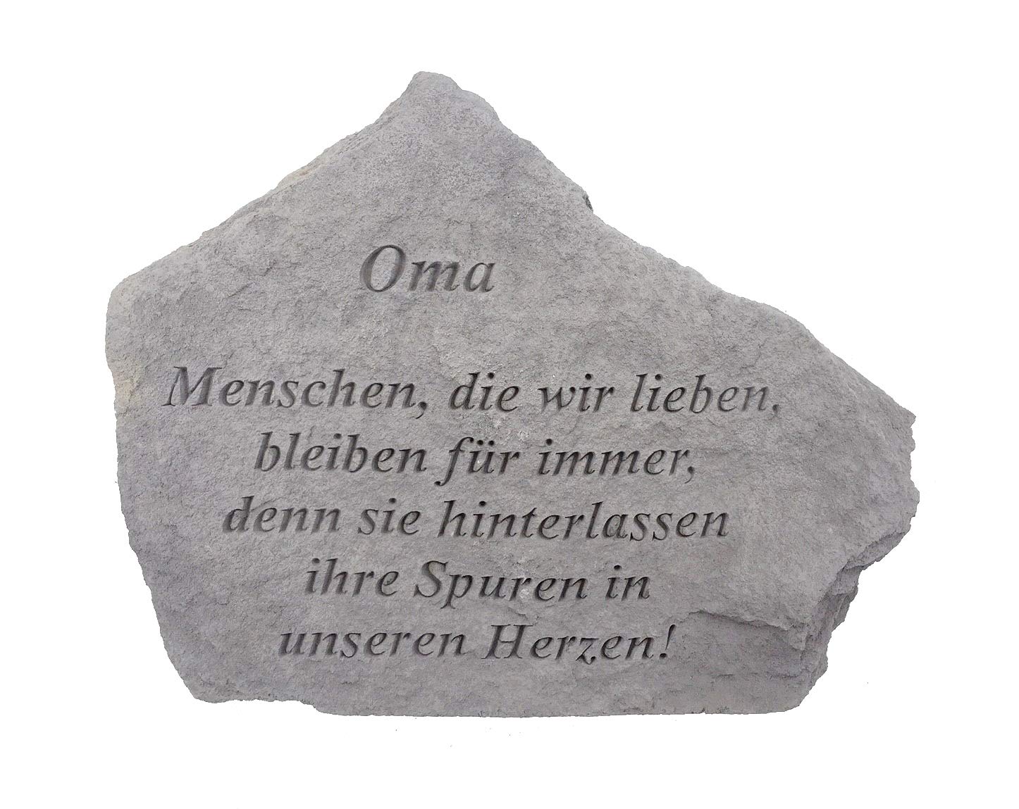 Ein besonderer Gedenkstein für deine Oma - um die Erinnerung für immer wachzuhalten. Aus frostfestem Steinguss, Maße: 18 x 14 x 2 cm, Gewicht: 0,6 kg. Mit dem berührenden Spruch: 'Menschen, die wir lieben, bleiben für immer, denn sie hinterlassen ihre Spuren in unseren Herzen!' Auf der Rückseite ist eine Aufhängevorrichtung - du kannst den Stein also entweder hinlegen oder aufhängen. Perfekt als Grabschmuck auf dem Friedhof, für die Gartengestaltung oder für eine Gedenkecke zu Hause. Hochwertige Verarbeitung von DEKOWELT - made with love. Schaffe einen würdevollen Ort des Gedenkens für deine geliebte Oma. Ein tröstliches Andenken, das die Verbindung über den Tod hinaus symbolisiert.