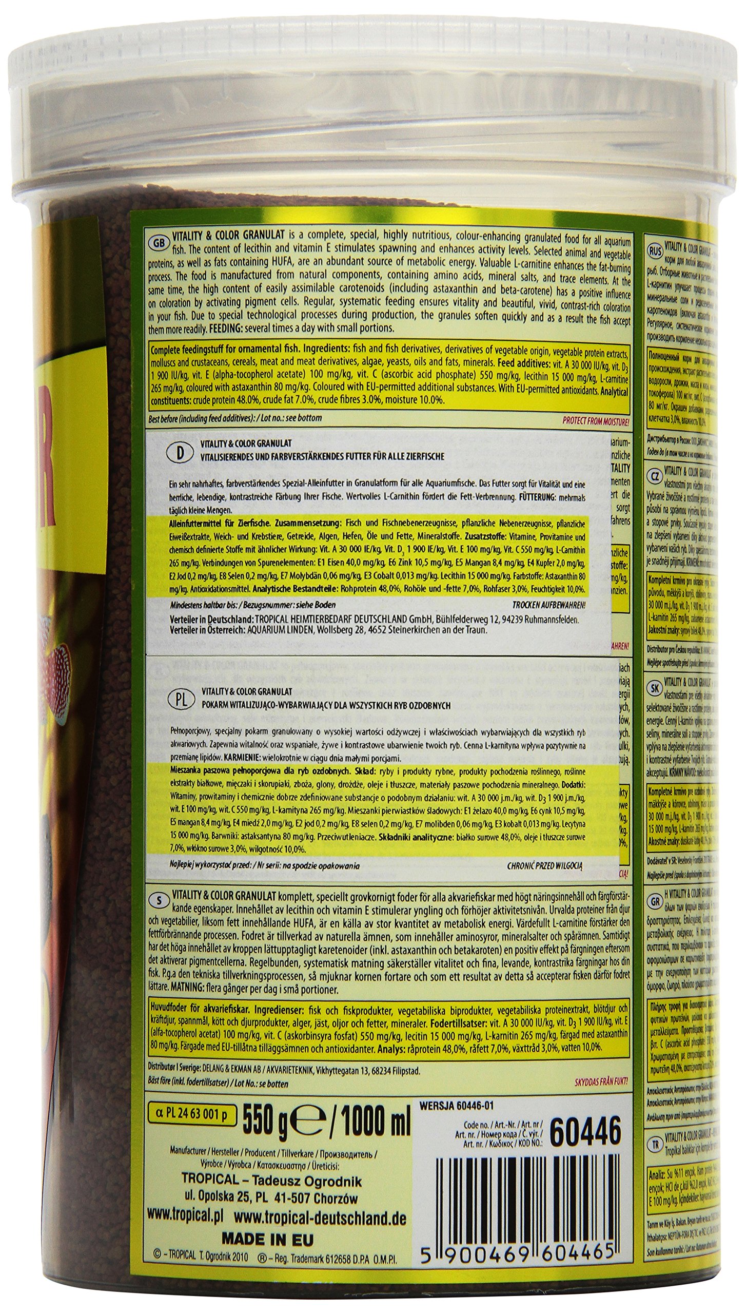 Deine Fische sollen nicht nur satt, sondern auch schön bunt sein? Mit Tropical Vitality Color Flockenfutter klappt das! Dieses spezielle Futter enthält Astaxanthin und andere Carotinoide aus Krill und Garnelen, die die natürlichen Farben deiner Fische intensivieren. Aber es kann noch mehr: Hochwertiges Protein, Lecithin, Vitamin E und L-Carnitin sorgen für Vitalität und unterstützen sogar die Laichbereitschaft. Das langsam sinkende Granulat ist ideal für Allesfresser und fleischfressende Fische. Einfach mehrmals täglich kleine Portionen füttern - deine Fische werden's dir danken! Die 1-Liter-Packung reicht lange und ist ein echter Allrounder für alle Zierfische in deinem Aquarium. Für gesunde, aktive und farbenprächtige Fische!
