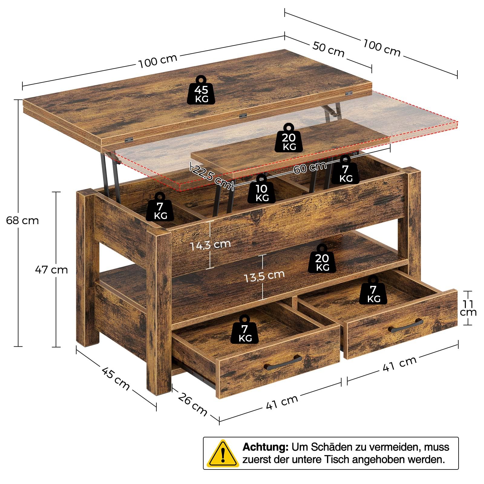 Dieser Couchtisch ist ja mal richtig clever! Höhenverstellbar - von Couchtisch zu Esstisch in Sekunden! Mit coolen RGB-LEDs - per Fernbedienung farbig wechseln! Sogar mit Musik-Sync - dein Wohnzimmer wird zur Disco! Zwei Schubladen und versteckter Stauraum - alles hat seinen Platz! 90x50 cm groß - perfekt für 4-6 Personen! Aus stabilem Material - kein Wackeln! Gasdruckfedern für easy Höhenverstellung! Einfach selbst aufzubauen - Anleitung dabei! In Weiß/Holz oder Vintage Braun erhältlich! Perfekt für kleine Wohnungen - zwei Möbel in einem! Deine Gäste werden staunen! Ob fürs gemütliche Fernsehen oder ne Runde Essen - immer praktisch! Modernes Design das was her macht! Einfach bestellen und dein Wohnzimmer upgraden! Auch super für Partyabende - die LEDs machen richtig Stimmung!