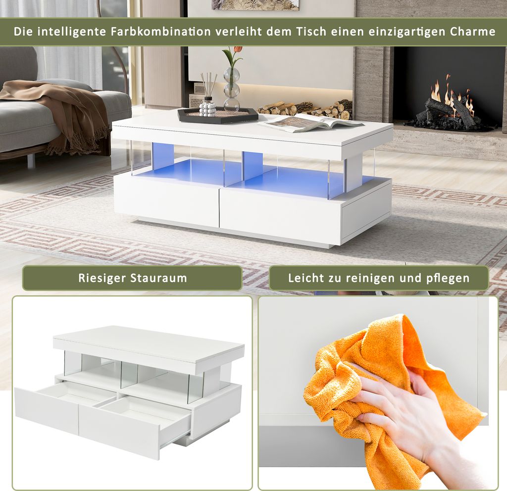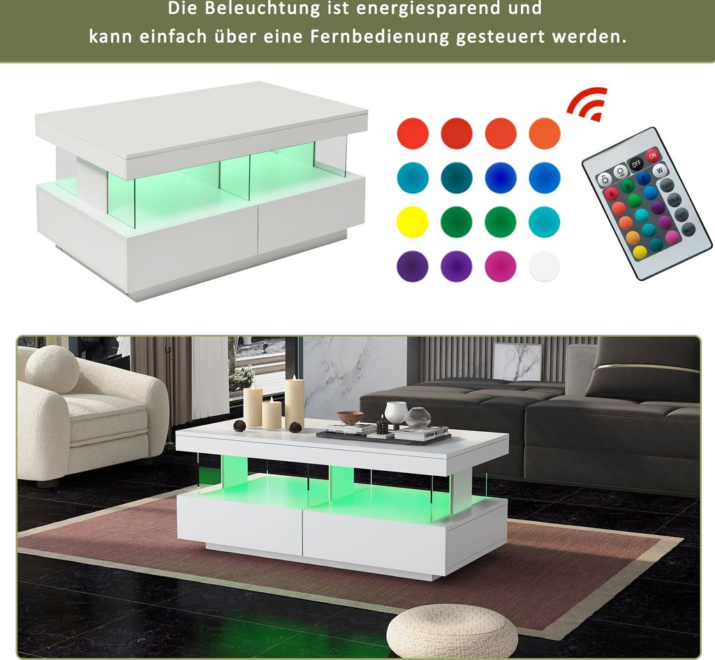 Wow, dieser Couchtisch ist ja mal richtig clever! Der Lcoho 4-in-1 kann nämlich alles: Mit Hydraulik von 45 auf 59cm hochfahren - perfekt mal als Couchtisch, mal als Esstisch oder Schreibtisch. Und er hat mega viel Stauraum: Zwei Schubladen mit coolen Rückprallschaltern, halboffenen Ablagebereich und sogar versteckten Stauraum unter der Klappplatte. Das i-Tüpfelchen? Die LED-Beleuchtung steuerst du einfach per App - kannst Farbe und Helligkeit anpassen wie du magst. Und die beiden Hocker sind nicht nur Sitzgelegenheit, sondern auch noch Stauraum. Aus starker Spanplatte, trägt 50kg und die Hochglanz-Optik sieht einfach edel aus. Achtung: Kommt in zwei Paketen, also nicht wundern wenn nicht alles gleichzeitig ankommt!