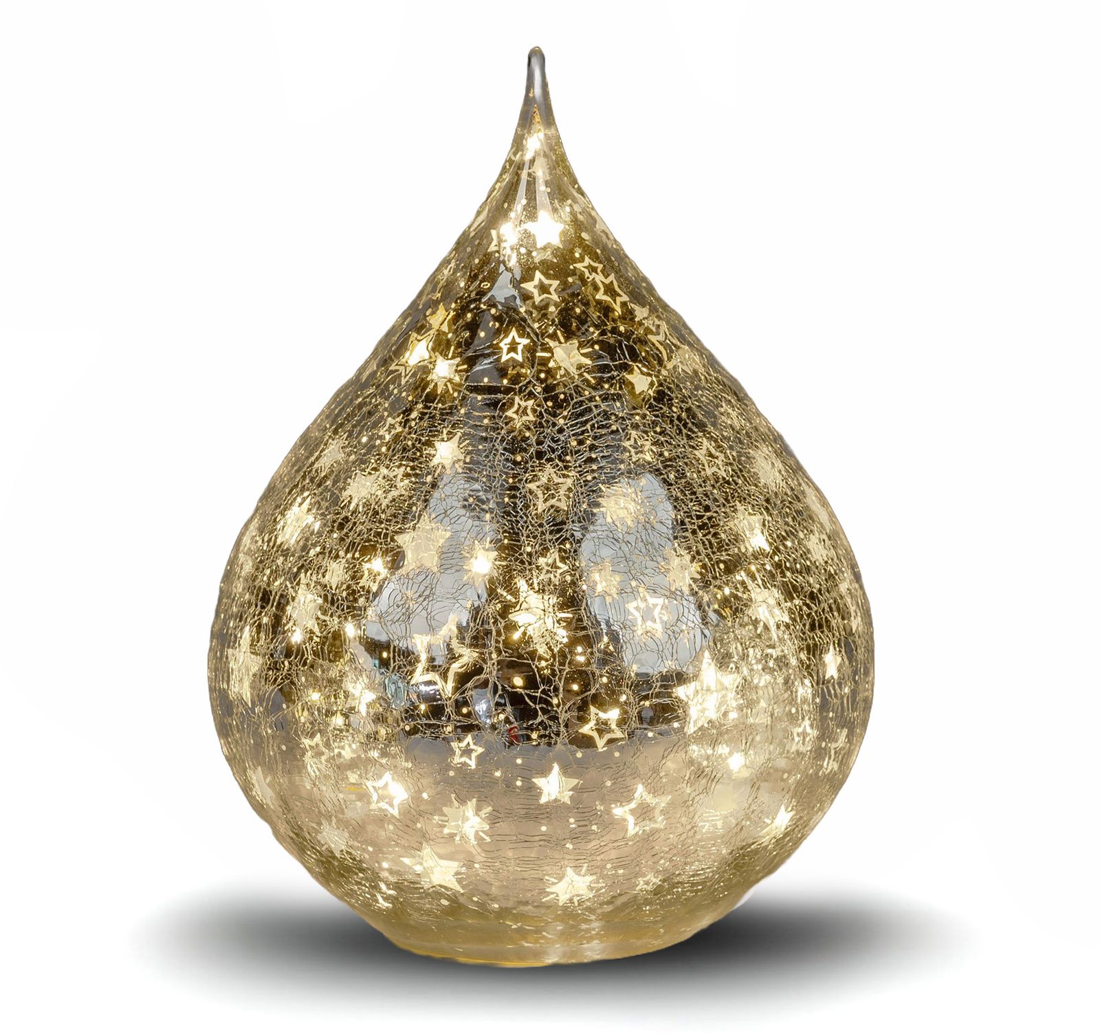 Verwandle dein Zuhause in eine magische Winterlandschaft! Dieser wunderschöne LED-Deko-Tropfen in edlem Rose-Gold mit Crackle-Glas-Optik bringt gemütliche Stimmung in jeden Raum. Mit 21cm Höhe ist er ein echter Hingucker auf Tischen, Regalen oder der Fensterbank. Die filigranen Stern-Ausschnitte zaubern bezaubernde Lichtmuster an Wände und Decken. Der praktische Timer schaltet die Leuchte nach 6 Stunden automatisch aus und nach 18 Stunden wieder ein - du musst an nichts denken. Batteriebetrieben (3x AA, nicht im Lieferumfang) für maximale Flexibilität ohne störende Kabel. Perfekt als Weihnachtsdeko, winterliche Tischdekoration oder einfach als stimmungsvolle Beleuchtung für gemütliche Abende. Einfach aufstellen, einschalten und den Zauber genießen!