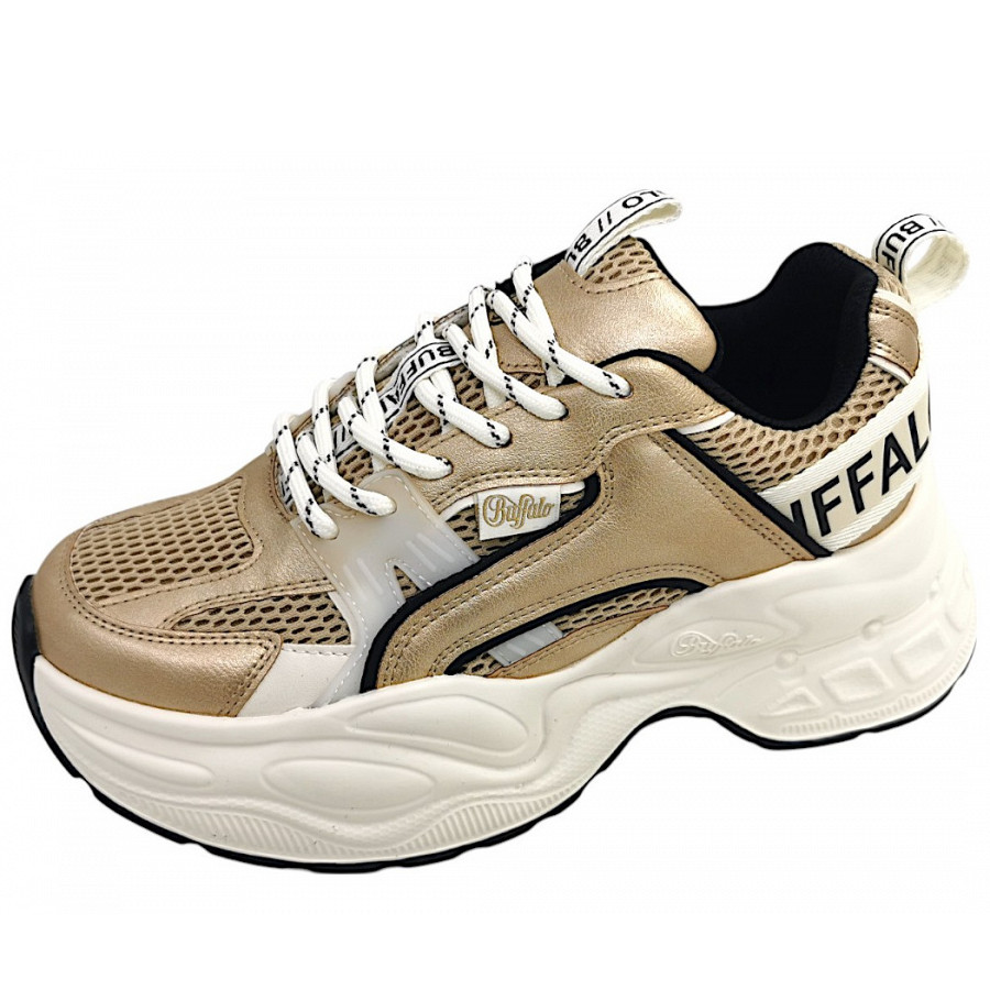 Total stylische Sneaker von Buffalo! Der Yuno in der trendigen Creme/Gold/Schwarz Kombination ist ein echter Hingucker. Aus hochwertigem Kunstleder gefertigt, mit praktischer Schnürung für perfekten Sitz. Der flache Absatz macht sie super bequem für den Alltag - ob zum Einkaufen, Arbeiten oder für die Freizeit. Medium Weite passt den meisten Füßen ideal. Buffalo Qualität spürt man sofort - verarbeitet sind diese Sneaker einfach top! Perfekt zu Jeans, Röcken oder Kleidern. Ein Must-have für jede modebewusste Frau, die Wert auf Komfort und Style legt!