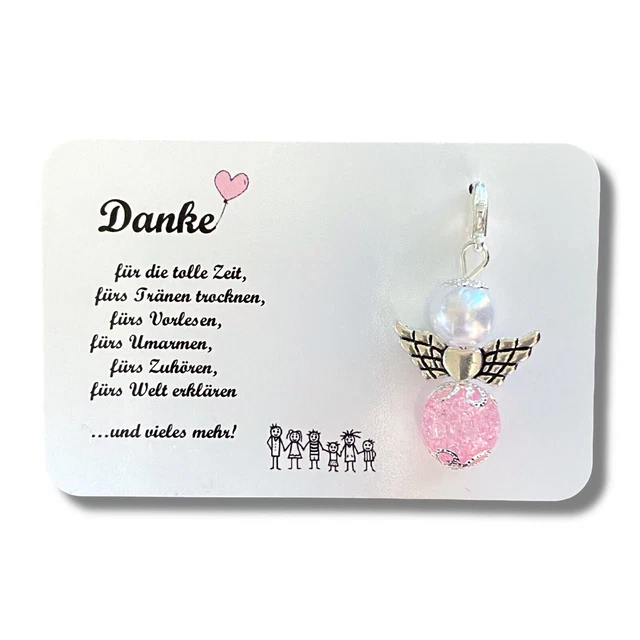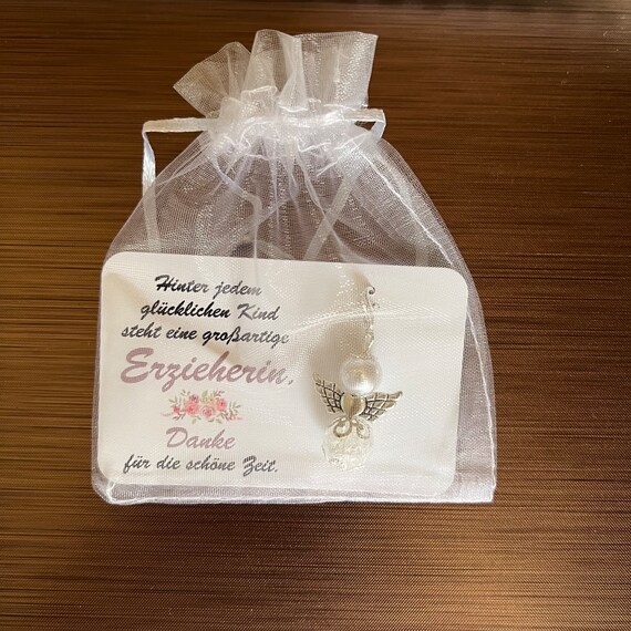 Das perfekte Dankeschön für tolle Erzieherinnen! Diese süße Schutzengel-Karte mit Perlenengel ist ideal zum Abschied aus dem Kindergarten oder als kleine Aufmerksamkeit für Tagesmütter. Die Karte ist 8,5x5,5cm groß, aus stabilem Karton in Hochglanz-Qualität. Der Perlenengel mit Karabinerhaken hat eine Gesamtlänge von ca. 4,5cm und silberne Flügel. Komplett verschenkfertig in einem schönen Organzasäckchen verpackt. Einfach zu befestigen an Tasche, Schlüsselbund oder Pinwand. Zeige deine Wertschätzung mit diesem liebevollen Geschenk. Perfekt für den Abschied aus der Kita, zum Geburtstag oder einfach als kleines Dankeschön. Eine herzliche Geste die garantiert Freude macht. Von MiniGeschenke.de - den Experten für kreative Geschenkideen!