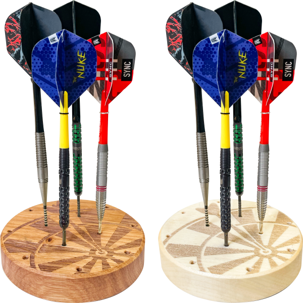 Wow, dieser Dartständer von DARTSTURM ist einfach genial für alle Darts-Fans! Aus hochwertigem Echtholz in deiner Wahl - entweder hellem Ahorn oder dunklem Eichenholz - sieht das Teil nicht nur mega stylisch aus, sondern ist auch super praktisch. Du kannst hier bis zu vier komplette Dartsets unterbringen, also insgesamt 12 Darts! Die aufgelaserte Dartscheibe auf der Oberseite gibt dem ganzen noch den richtigen Flair. Das coole Feature: Die Löcher sind in einem speziellen Winkel eingearbeitet und passen sowohl für Steeldarts als auch für E-Darts. Die Unterseite hat Moosgummi, damit der Ständer sicher steht und nicht rutscht. Jeder Ständer ist ein Unikat, da Echtholz immer etwas in Maserung und Farbe variiert - das macht's doch erst richtig besonders! Perfekt für die heimische Dartsammlung oder auch für die Bar um die Ecke. Einfach die Darts reinstecken und deine Sammlung sicher und ordentlich präsentieren. Darts und Zubehör sind übrigens nicht im Lieferumfang enthalten, aber das weißt du ja als echter Dart-Profi sicher schon!