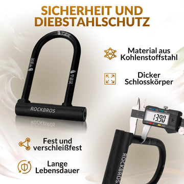 Dein Bike sicher abschließen? Mit dem DINOKA U-Bügelschloss kein Problem! Aus gehärtetem Hochleistungsstahl - hält auch Bolzenschneidern stand. Inklusive 1,2 m flexiblem Stahlseil für Vorderrad oder Zubehör. Maße 28x16 cm, mit praktischer Halterung fürs Fahrrad. Wasserdicht und mit Silikagel-Schicht gegen Kratzer. Komplexer Serpentinen-Schlüsselschlitz für extra Sicherheit. Zwei Schlüssel aus reinem Kupfer - falls mal einer verloren geht. Passt auch für E-Scooter und Motorräder. Einfach das beste Schloss für dein wertvolles Rad!