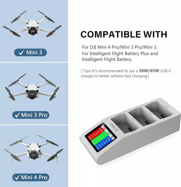 Intelligentes Laden für deine DJI Drohne! Dieses 2-Wege-Ladegerät ist kompatibel mit Mini 5 Pro und Mini 3 Pro Akkus. Ladet bis zu 2 Akkus gleichzeitig - auch gemischt mit Standard- und Langzeitakkus. Mit Digital Display für klare Statusanzeige. Schnellladefunktion: 2453mAh Akku in 60 Minuten, 3850mAh in 80 Minuten voll. Zwei Modi: Lademodus für volle Aufladung oder Speichermodus (60-65% für Langzeitlagerung). Kompakt (8,4x6x6,3cm) und leicht (159g) - ideal für unterwegs. Inklusive USB-C Kabel. Mach deine Drohne immer startbereit!