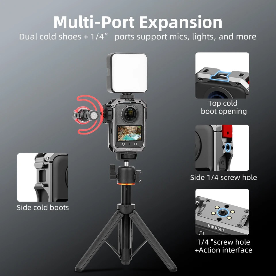Schütz deine DJI Osmo 360 Kamera richtig! Dieser Aluminium-Käfig passt perfekt (1:1) und schützt vor Stößen und Kratzern. Mit doppelter Sicherheitsverriegelung - nichts fällt versehentlich runter. Kompatibel mit dem originalen magnetischen Schnellspanner und Ladeanschluss. Extra 1/4-Zoll-Gewinde für Stativaufnahmen und Kaltschuh-Halterungen für Mikrofone oder Lichter. Super praktisch: Akkuwechsel möglich, ohne den Käfig abnehmen zu müssen. Inklusive Silikon-Objektivdeckel, Displayschutzfolie und Umhängeband. Ob für Offroad-Abenteuer oder Stadt-Touren - deine Kamera ist sicher geschützt!