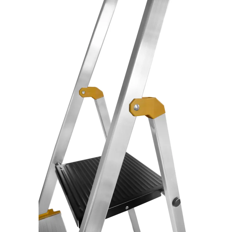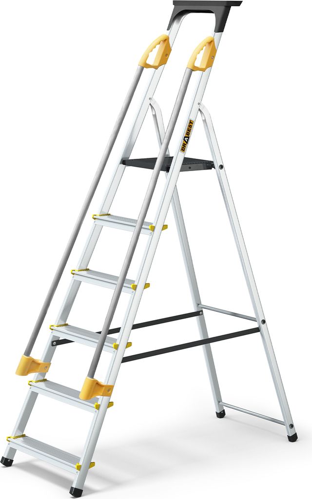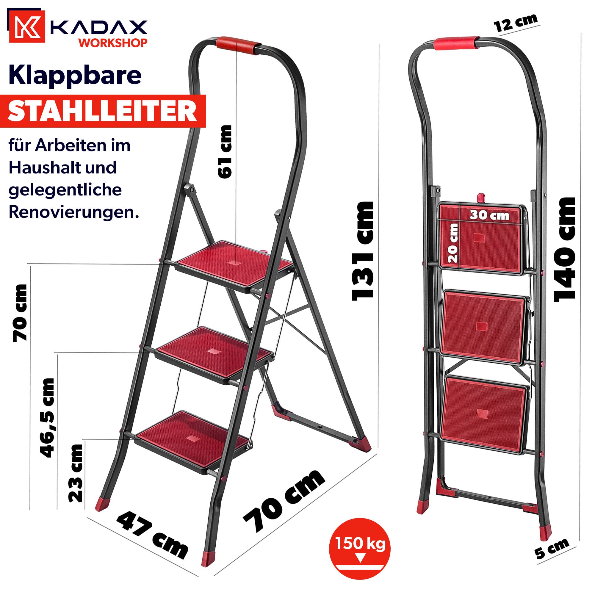 Endlich eine Leiter, die nicht wackelt! Die DRABEST 3-stufige Stahlleiter ist dein perfekter Helfer für zu Hause, in der Werkstatt oder im Büro. Mit extra verstärkten Holmen für maximale Stabilität - trägt problemlos bis zu 150 kg! Die drei breiten Stufen (31x20,5 cm) haben eine Anti-Rutsch-Beschichtung, damit du sicher stehst. Die oberste Sprosse ist zusätzlich mit rutschfestem Material geschützt. Die stabilen Füße schonen deine Böden und verhindern das Wegrutschen. Zusammengeklappt ist sie nur 5 cm schmal - super platzsparend! Maße: 116x90x5 cm, Gewicht nur 5,6 kg. EN 14183 zertifiziert - erfüllt also alle europäischen Sicherheitsstandards. Arbeitshöhe bis 2,70 m - perfekt für Lampen wechseln, Regale einräumen oder Malerarbeiten. Hergestellt in der EU, sofort einsatzbereit. Deine Alltags-Heldin für alle Höhen!