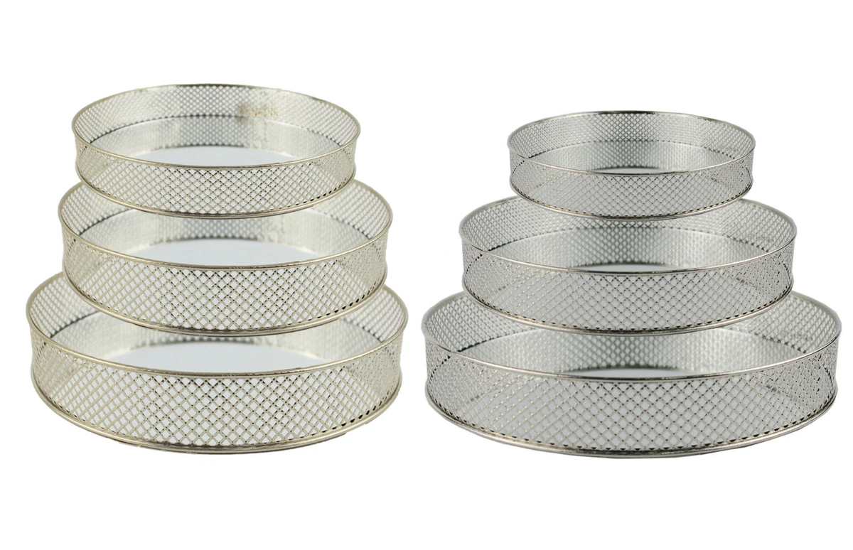 Wunderschönes 3-teiliges Tablett-Set von DRULINE! In silbernem Metall mit spiegelnder Oberfläche. Drei Größen: 20cm, 26cm und 29cm Durchmesser - perfekt abgestimmt.
