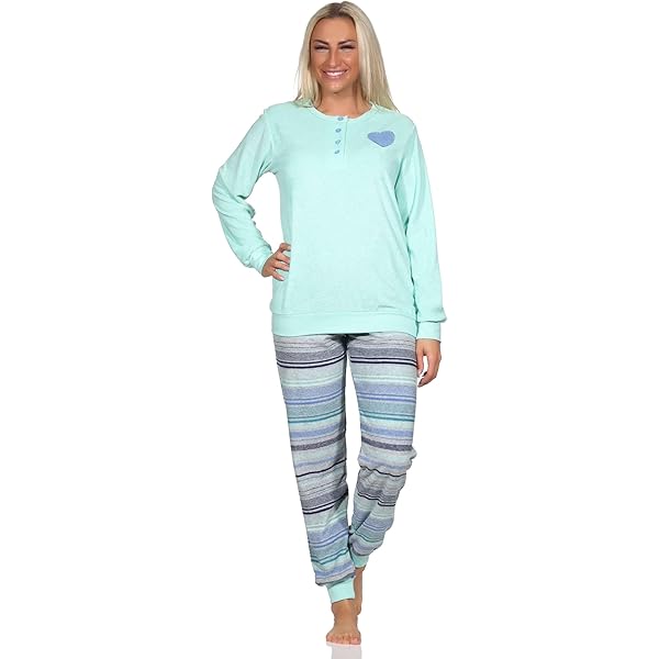 So gemütlich schläft es sich wie in Wolken! Der Normann Pyjama aus weichem Frottee besteht aus 80% Baumwolle und 20% Polyester - kuschelig weich und trotzdem robust. Das rosafarbene Oberteil hat eine praktische Knopfleiste und wird durch eine süße Herz-Applikation verziert. Dazu passend die Hose in Rosa, Weiß und Grau mit dezenten Streifen. An Ärmeln und Hosenbeinen sorgen Bündchen für perfekten Sitz. Perfekt für kühlere Abende, wenn man's sich zuhause gemütlich machen will. Und das Beste: Der Pyjama ist super pflegeleicht, einfach in die Waschmaschine stecken und bei Bedarf bügeln. Ob für lange Filmabende auf dem Sofa oder erholsamen Schlaf - dieser Pyjama begleitet dich durch gemütliche Stunden. Die Passform ist bequem geschnitten, nicht zu eng, nicht zu weit - einfach ideal zum Wohlfühlen. Ein echter Klassiker, der in keiner Damen-Garderobe fehlen sollte!