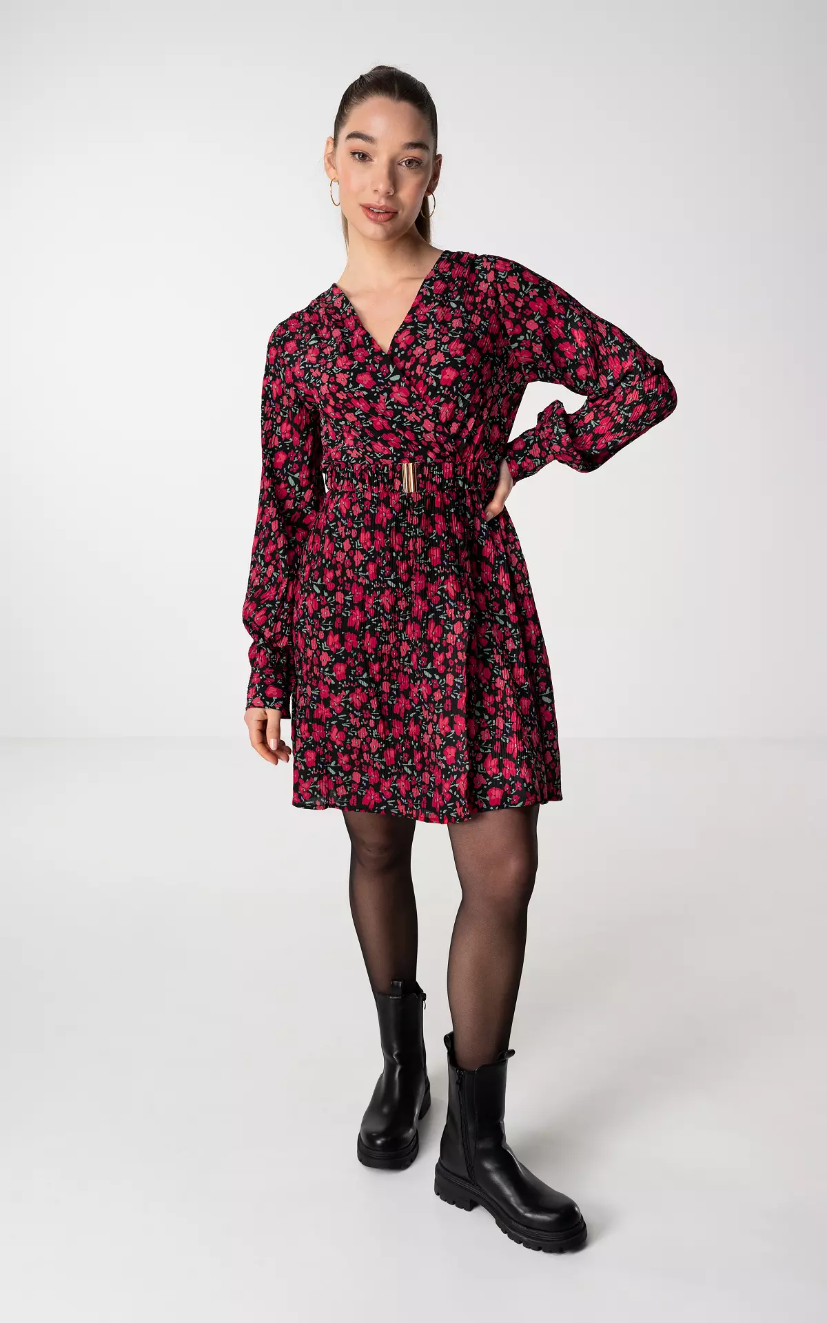 Der V-Ausschnitt betont deine Figur und die kurzen Ärmel sind perfekt für viele Anlässe. Der rote Bindegürtel gibt dem Kleid noch den besonderen Retro-Charme.