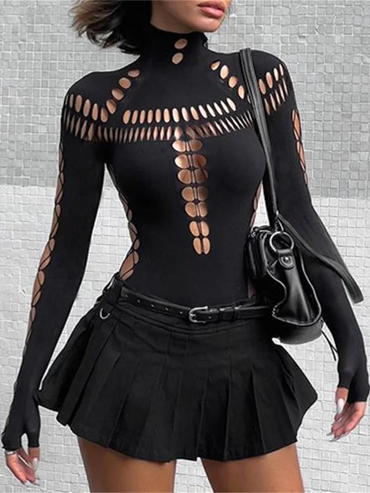 Suchst du nach einem ausgefallenen Outfit für die nächste Party oder Rave? Dieser schwarze Hollow Out Body von ST.Manrdy ist absolut im Y2K-Style! Mit seinen ausgeschnittenen Details und langen Ärmeln sorgst du garantiert für Aufsehen.