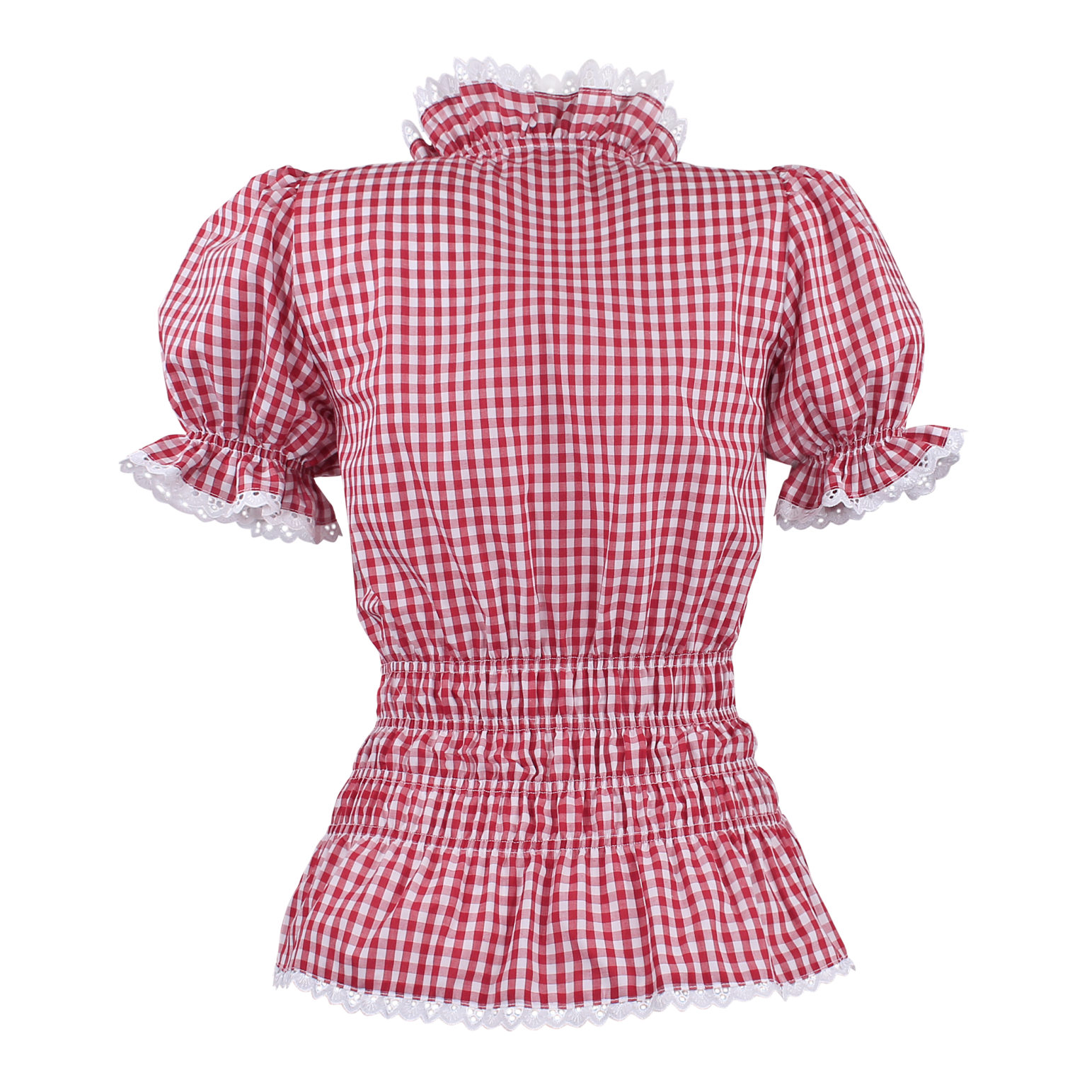 Oktoberfest-Feeling pur! Dieses komplette Trachten-Set von ZJKUBOIS bringt Wiesn-Stimmung in deinen Kleiderschrank. Enthalten: 1x rot-weiß karierte Bluse mit tiefem U-Ausschnitt, 1x Edelweiß-Halskette, 1x Edelweiß-Ohrstecker und 1x Ring.\n\nDie Bluse hat coole Puffärmeln, ist tailliert geschnitten und mit stylischen Herzknöpfen aus Metall. Der gerüschte Ausschnitt und die Ärmelbündchen sehen einfach authentisch aus. Aus reiner Baumwolle - weich und hautfreundlich.\n\nPerfekt zur Lederhose, aber auch zu Jeans oder Chino. Fürs Oktoberfest, Volksfeste, Mottopartys oder einfach mal so. Vereinigt traditionellen und modernen Style auf charmante Weise.\n\nAuch ein super Geschenk für Freundinnen oder Familie! Einfach anziehen und die Wiesn-Stimmung genießen - auch wenn grad kein Fest ist!