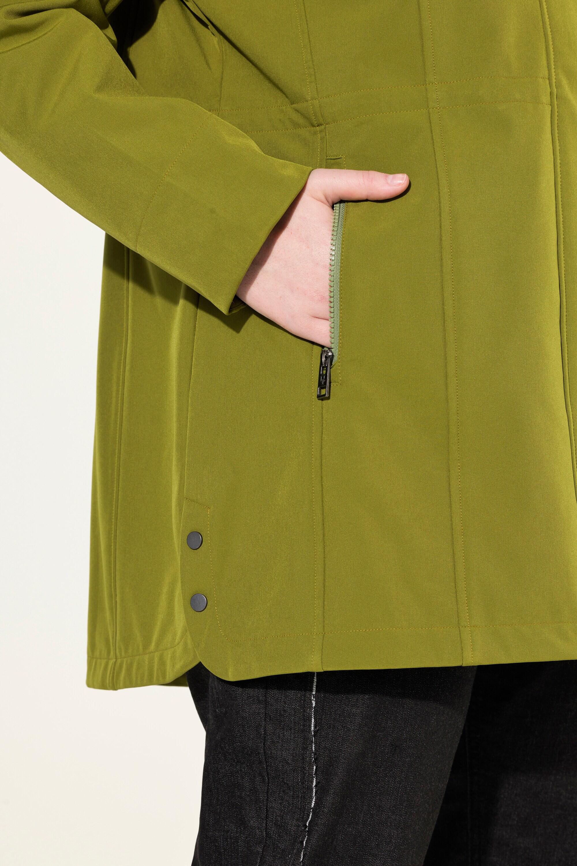 Perfekte Jacke für jedes Wetter! Die Ulla Popken Hyprar Softshelljacke ist dein zuverlässiger Begleiter bei Wind und Wetter. Mit ihrer Dreifach-Funktion: wasserdicht, winddicht und atmungsaktiv - was will man mehr? Die weiche Fleece-Innenseite wärmt angenehm, ohne dass man schwitzt. Praktisch: Die Kapuze ist abnehmbar, sodass du sie je nach Wetter anpassen kannst. Der verdeckte Reißverschluss und die Reißverschlusstaschen sehen nicht nur gut aus, sondern sind auch super praktisch. Die A-Linie passt sich deiner Figur perfekt an und die seitlichen Saumschlitze mit Druckknöpfen geben dir mehr Bewegungsfreiheit. Hinten etwas verlängert für extra Sitzkomfort. Ob zum Einkaufen, Spazierengehen oder für den Arbeitsweg - diese Jacke macht immer eine gute Figur und hält dich trocken und warm. Ulla Popken Qualität, die man sieht und spürt!