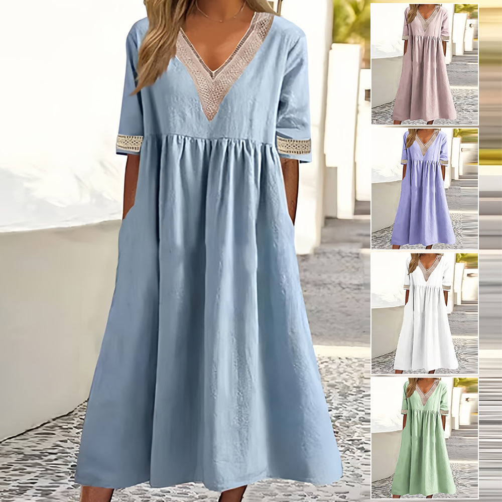 • Chiffon Sommerkleid Damen - V-Ausschnitt, Plissiert & Mit Taschen, Midilänge