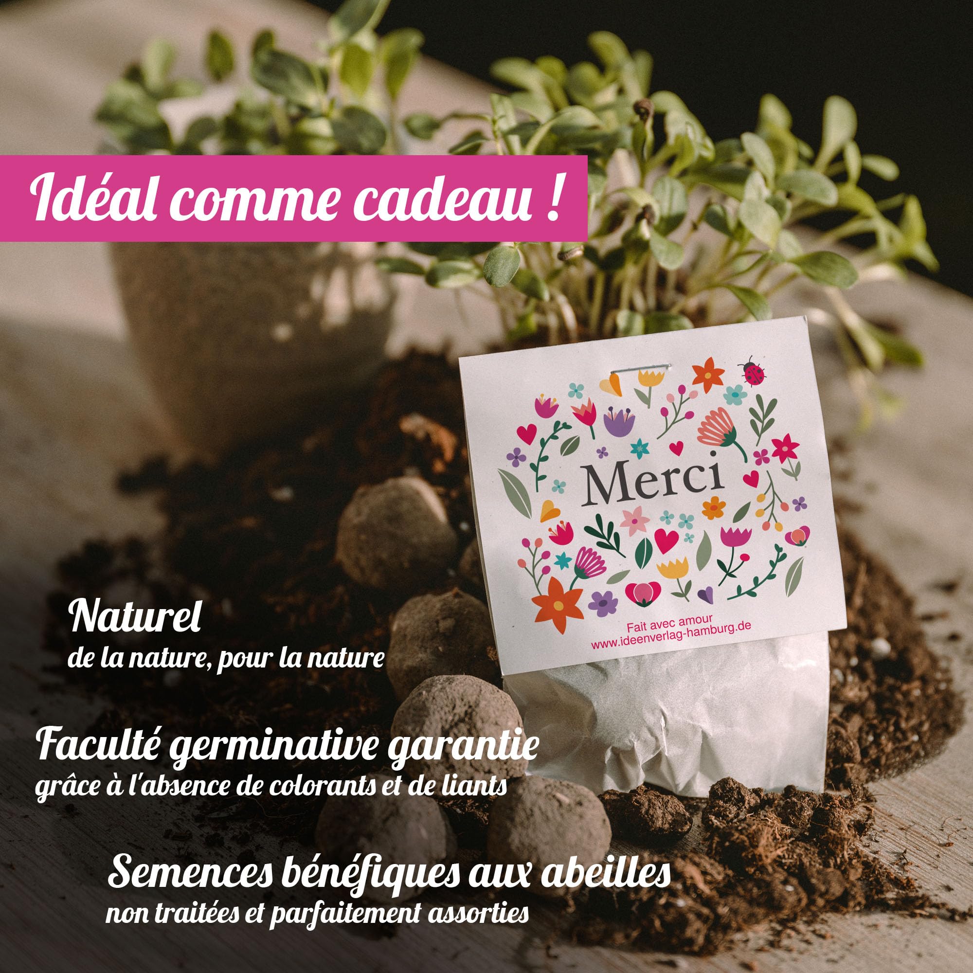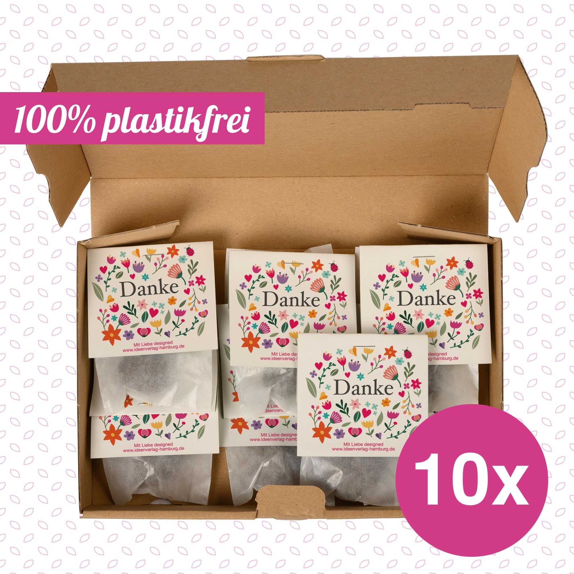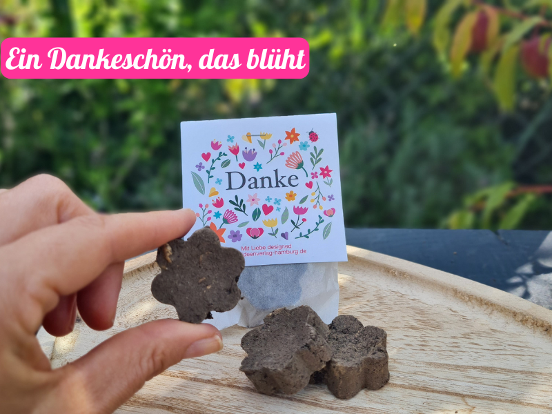 Schenk Blühfreude und sag Danke! Diese 10 Samenbomben in süßer Blumenform sind das perfekte nachhaltige Mitgebsel. Jede Kugel (2-3 cm Durchmesser) ist handgerollt und enthält bienenfreundliches Saatgut wie Ringelblumen, Kornblumen und Klatschmohn. Einfach in die Erde legen, gießen und staunen! Vollständig in Deutschland hergestellt - Design, Druck und Produktion. Die Verpackung ist zu 100% plastikfrei. Perfekt als Gastgeschenk, für Kollegen, Kindergeburtstage oder einfach als kleines Dankeschön. Von Menschen mit Handicap liebevoll gefertigt. Ideale Wurfzeit: März bis August. Ein Geschenk, das wirklich nachwächst und Bienen glücklich macht!