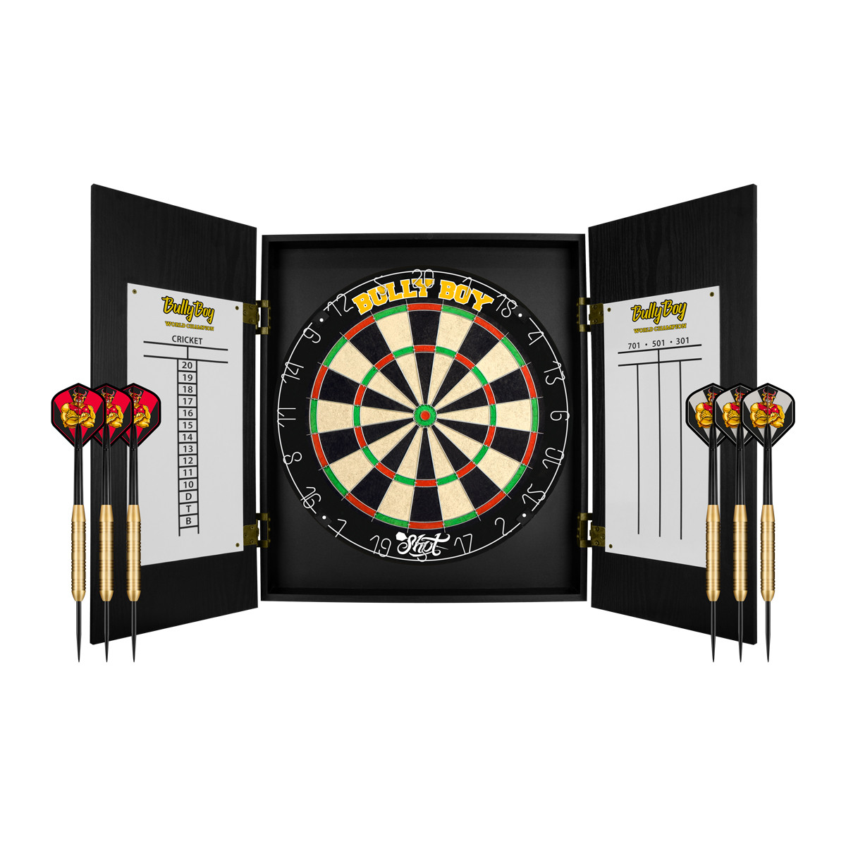 Profidarts vom Feinsten! Die Michael Smith Bully Boy Darts von Shot sind aus 90% Tungsten gefertigt - super schlank und präzise. Der Griff ist genial: Ringe und Vertikalfräsungen sorgen für perfekten Halt, die rot/schwarze PCT-Beschichtung sieht dazu noch richtig stylisch aus. Entwickelt in Neuseeland nach den exakten Vorgaben von Michael Smith selbst. Die Verarbeitung ist absolut sauber, jedes Detail sitzt. Mit den Präzisionsringen hast du immer den richtigen Bezugspunkt. Ob für Training oder Turnier - mit diesen Darts triffst du sicher ins Schwarze. Inklusive Schäfte und Flights, also sofort spielbereit. Einfach klasse Pfeile für anspruchsvolle Spieler!