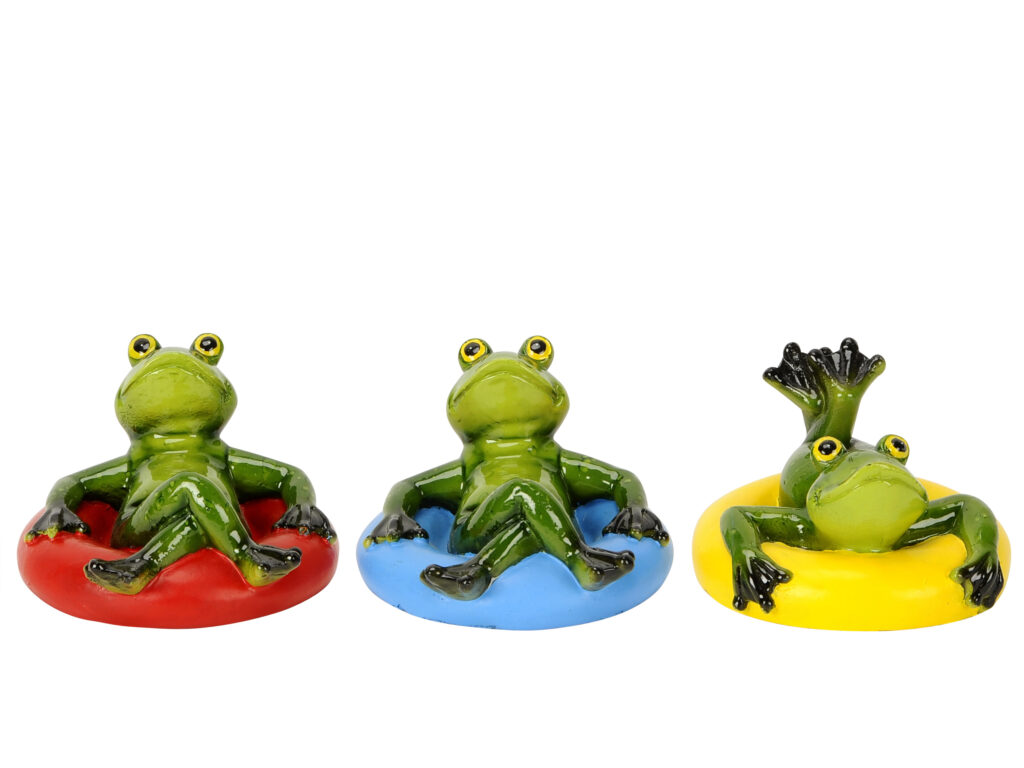 Wie niedlich sind diese Teichfrösche! 4 verschiedene Motive im Set - einer lehnt am Reifen, einer liegt drauf, und zwei rudern. Aus hochwertigem Harz - leicht und extrem langlebig. Größen zwischen 13-18cm - perfekt für Miniteich oder Gartenteich. Wetterfest - hält Sonne, Regen und Frost stand. Schwimmen auf dem Wasser - sehen total lebendig aus. Auch für drinnen geeignet - Wohnzimmer, Terrasse oder Balkon. Bringt sofort gute Laune in deinen Garten. Einfach ins Wasser setzen und sich freuen!