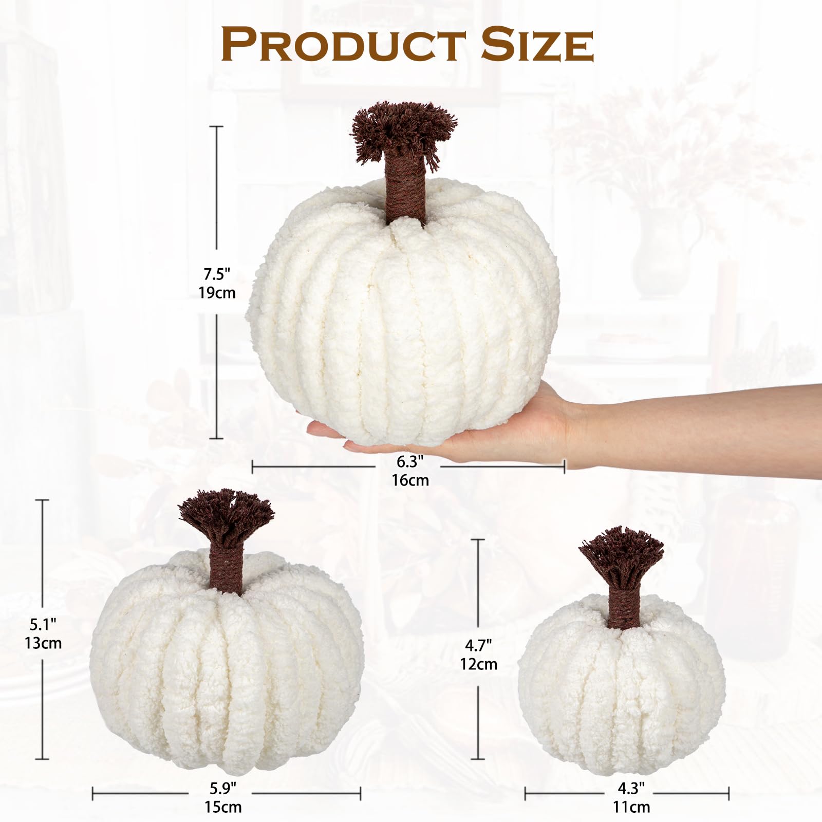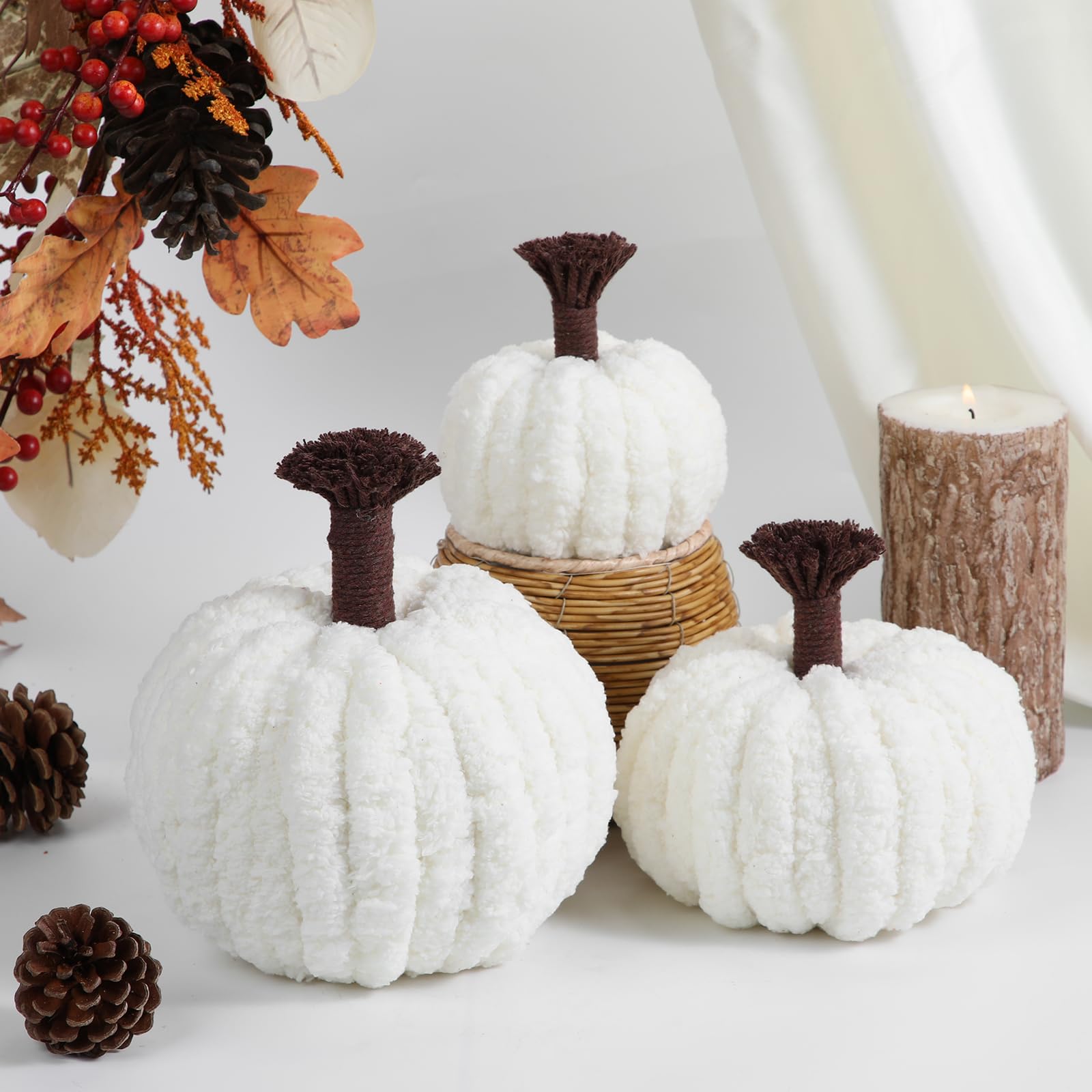 So kuschelig war Herbstdeko noch nie! Diese 3 Mini-Kürbisse aus ultraweicher Lammwolle und Vliesstoff bringen gemütliche Herbststimmung in dein Zuhause. In den Farben Orange, Braun und Weiß (je 9,5x9,5x6 cm) sind sie perfekt für die Jahreszeit. Jeder Kürbis ist mit einem niedlichen Filz-Ahornblatt verziert - einfach bezaubernd! Super weich und kuschelig, fühlen sie sich toll an und sind dabei robust und langlebig. Perfekt für die Herbst- und Halloweenzeit: Stell sie auf den Esstisch, ins Regal, auf den Kaminsims oder in einen dekorativen Korb. Sie eignen sich auch super für Kränze, Gestecke oder als Fotorequisiten. Ob im Wohnzimmer, Schlafzimmer, auf der Terrasse oder beim Thanksgiving-Fest - diese Kürbisse verbreiten sofort eine warme, gemütliche Atmosphäre. Besonders passend für Bauernhaus- oder Landhausstil, aber auch in modernen Wohnungen ein Hingucker. Einfach hinstellen und sich an der herbstlichen Stimmung erfreuen! Auch als kleines Geschenk für Herbst-Liebhaber super geeignet. Diese süßen Kürbisse machen einfach gute Laune!
