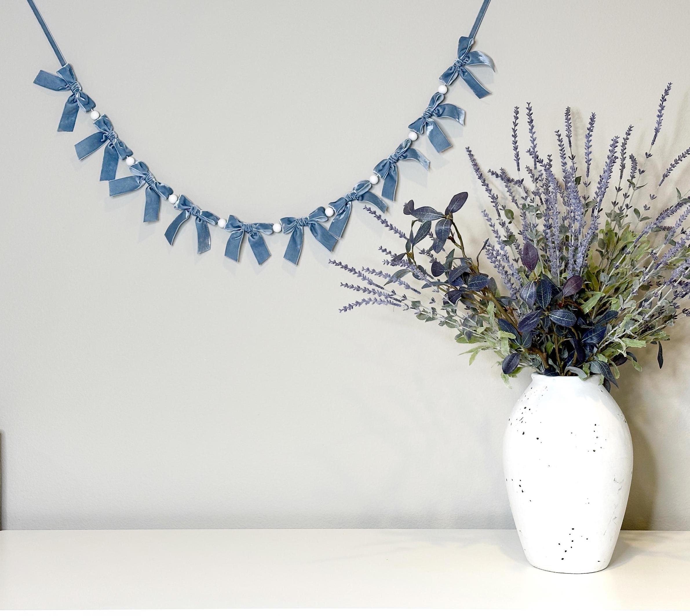 Die Girlande kommt fertig gebunden - kein lästiges Selberbasteln nötig. Einfach entfalten, aufhängen und staunen, wie der Raum sofort festlich wirkt. Die verschiedenen Blautöne und Schleifengrößen sehen mega edel aus.