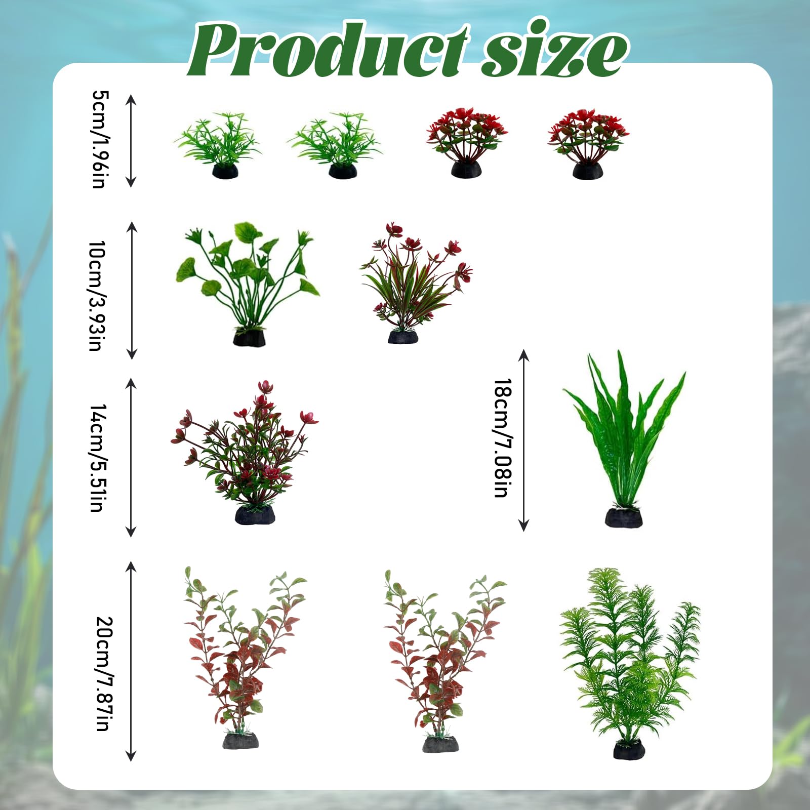 Macht jedes Aquarium zum echten Hingucker! Dieses 11-teilige Set mit künstlichen Wasserpflanzen in Grün und Rot sieht super natürlich aus. Verschiedene Höhen von 5cm bis 20cm - für abwechslungsreiche Unterwasserlandschaften. Die weichen Blätter sind fischtisch und verletzen keine Tiere. Mit Sockel für stabilen Stand im Kies. Keine besondere Pflege nötig - einfach reinigen und fertig. Verändert nicht den pH-Wert des Wassers. Perfekt für Aquarien, Miniteiche oder Schildkrötenbecken. Einfach arrangieren und staunen wie lebendig dein Aquarium wirkt!