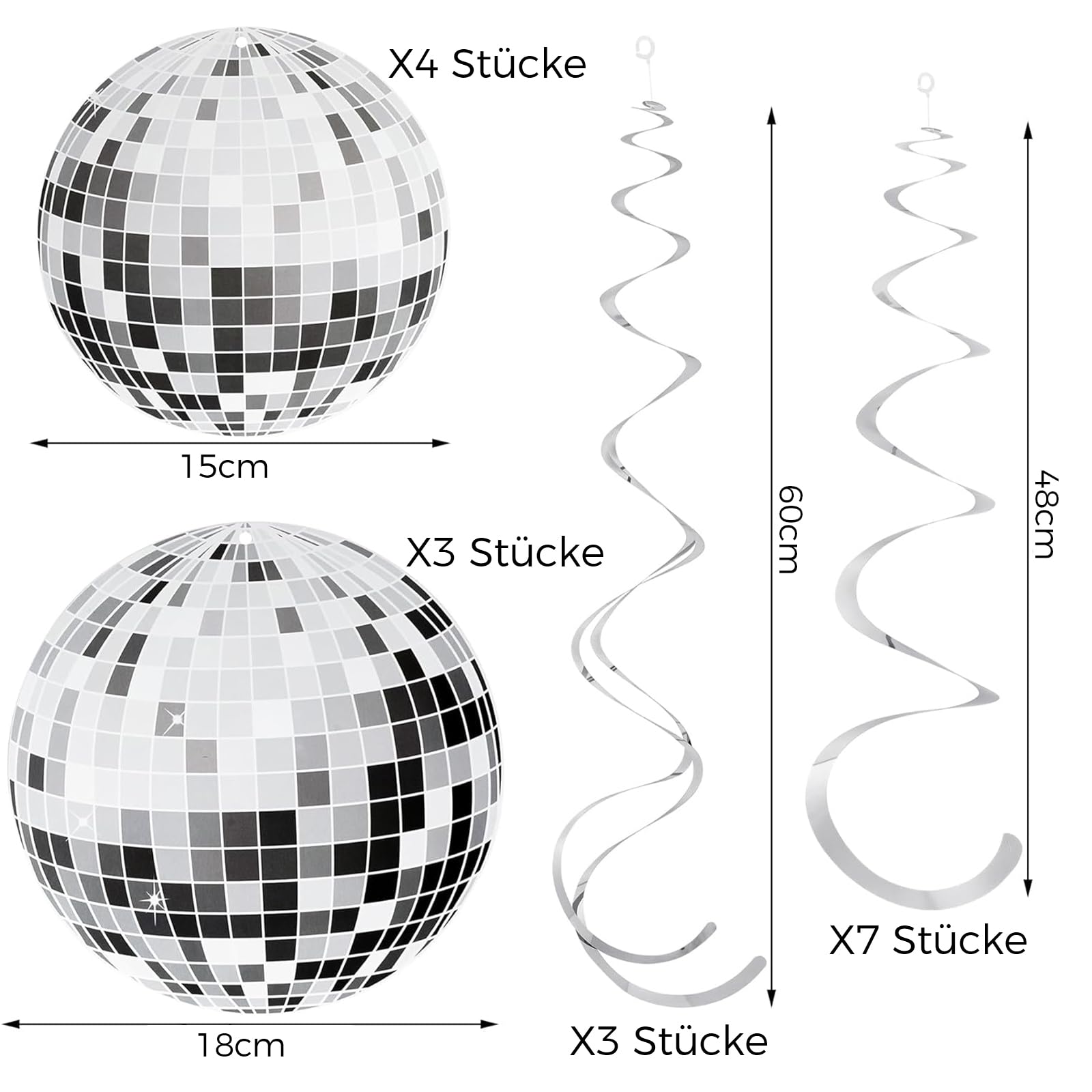 Wow, mach deine Party zu einer echten 70er Jahre Disco! Dieses 24-teilige Deko-Set bringt sofort Retro-Flair in deinen Partyraum. Enthalten sind 12 spiralförmige Discokugel-Anhänger und ein cooles Banner - alles in typischem Disco-Design. Die Spiegel-Elemente reflektieren das Licht und werfen funkelnde Lichtpunkte an die Wände - genau wie in einer richtigen Disco! Das Aufhängen ist supereinfach, denn alles ist schon mit robusten Aufhängeschnüren vorbereitet. Einfach aufhängen und die Party kann starten! Das Material ist hochwertig und du kannst die Deko mehrmals verwenden - ob für Geburtstage, Jubiläen oder einfach so für eine spontane Tanzparty. In nur wenigen Minuten verwandelst du jeden langweiligen Raum in eine tanzbare Disco-Location. Die Spiralelemente drehen sich sogar im Luftzug - das sieht mega aus! Hol dir den 70er Jahre Vibe zurück und lass die Disco-Kugeln funkeln!