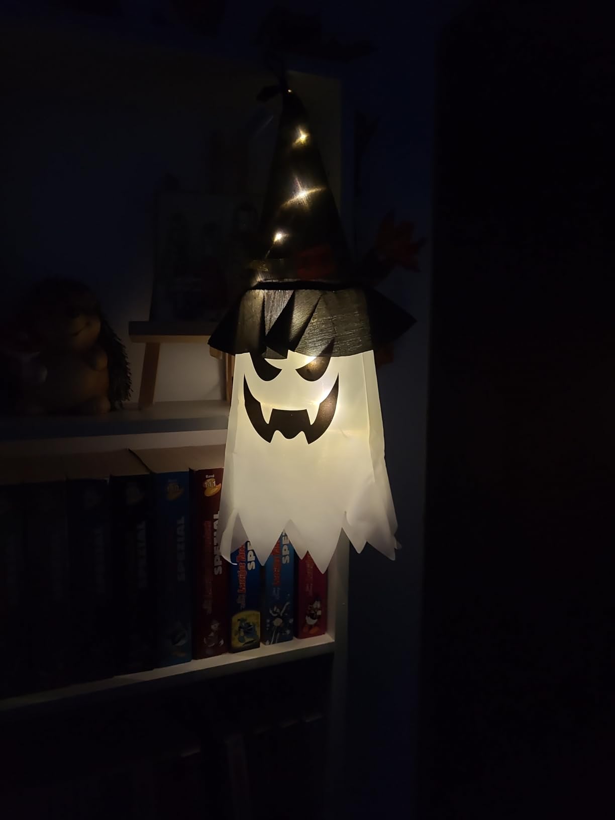 Gruseliger Spaß für Halloween! Dieses 5-teilige Set mit Geisterhexen-Hüten und 9,84ft Lichterkette bringt perfekte Stimmung. Jeder Hut mit 6 warmen LEDs, Geistergröße 43x18cm. Wasserdicht und batteriebetrieben (Batterien nicht enthalten). 8 Lichtmodi per Fernbedienung: blinken, wellen, kombinieren und mehr. Mit Auto-Timer (6h ein, 18h aus). Perfekt für Garten, Terrasse, Fenster oder Baum. Einfach zu montieren und super effektvoll. Mach dein Zuhause zur gruseligen Halloween-Party-Location! Ideal für Kindergeburtstage oder Garten-Deko. Aber Achtung: Nur für Outdoor-Nutzung und bei schlechtem Wetter abstecken!