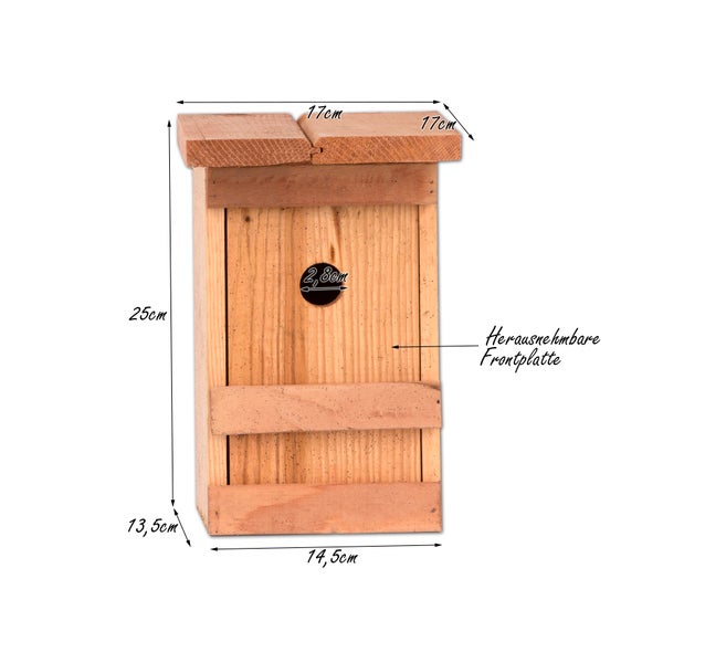 Vogelfreunde, dieser Nistkasten ist ein Traum für unsere gefiederten Freunde! Speziell für Meisenarten wie Blaumeise und Sumpfmeise designed. Das 28mm Einflugloch ist perfekt für die kleinen Vögel. Aus FSC-zertifiziertem Birkenholz - natürlich und langlebig. Pyramidenförmiges Design, lackiert für extra Witterungsschutz. Super praktisch: Die Vorderseite lässt sich öffnen, damit ihr den Kasten leicht reinigen könnt. Mit vormontiertem Haken für einfaches Aufhängen an Bäumen oder Wänden. Unterstützt die Artenvielfalt in eurem Garten und bietet den Vögeln einen sicheren Brutplatz. Einfach aufhängen und den Meisen beim Nisten zusehen!