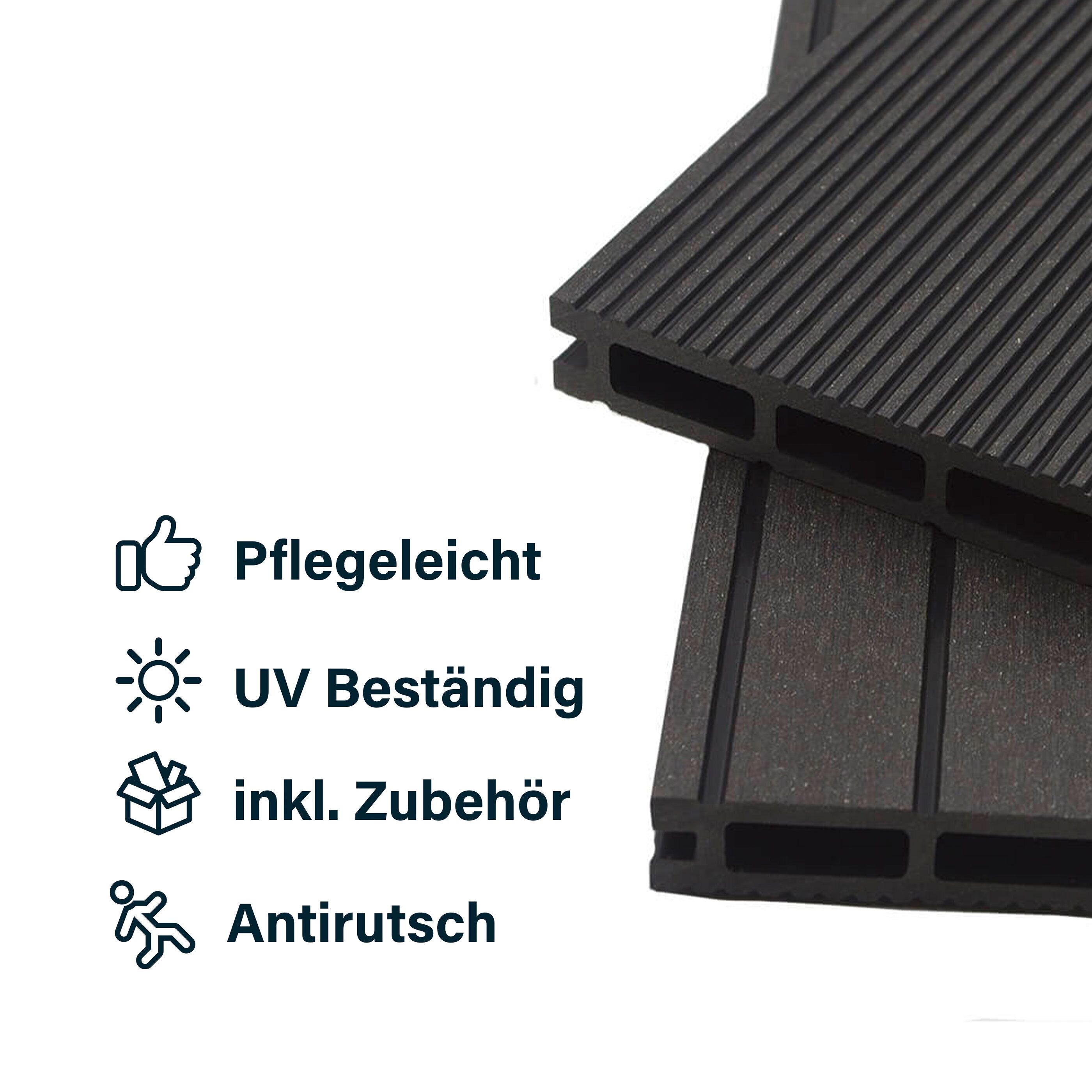 Endlich eine Terrasse, die wirklich was hermacht! Die WPC-Dielen von Home Deluxe sind der absolute Hit für deinen Außenbereich. Im Set mit allem, was du brauchst: Dielen, Unterkonstruktion und komplettes Montagezubehör. Die Dielen sind 220x14,6x2,1 cm groß und haben ein cleveres Klicksystem - damit baust du deine Terrasse im Handumdrehen zusammen. Aus Holz-Kunststoff-Verbund, also super pflegeleicht: kein Streichen, kein Ölen, einfach mal mit Wasser abspülen. Die Oberfläche ist splitterfrei und rutschhemmend, perfekt auch für Poolumrandungen. Hält 500kg pro m² aus und ist absolut witterungsbeständig. Mit Drainagegitter auf der Unterseite, damit nach dem Regen alles schnell trocknet. Mach aus deinem Garten oder Balkon eine echte Wohlfühloase!