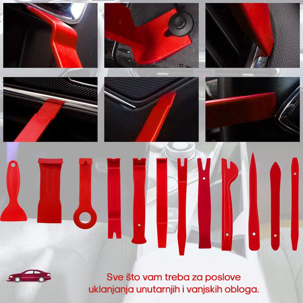 Macht Auto-Reparaturen zum Kinderspiel! Dieses 12-teilige Demontage-Set ist dein bester Freund, wenn's ans Schrauben im Innenraum geht. Kein Kratzen mehr am Lack, kein Ärger mit festgeklemmten Verkleidungen! 🛠️\n\nDas Set enthält 12 verschiedene Spezialwerkzeuge für:\n• Türverkleidungen\n• Armaturenbrett\n• Radio-Ausbau\n• Zierleisten\n• Scheiben und mehr\n\nAus robustem Material - hält auch bei grober Behandlung stand. Die ergonomischen Griffe liegen super in der Hand und schonen deine Kräfte.\n\nEinfach das richtige Werkzeug wählen, vorsichtig ansetzen und schon löst sich selbst die festeste Verkleidung ohne Schäden. Perfekt für Heimwerker und Hobby-Schrauber!\n\nNie wieder mit Schraubenzieher und Gewalt arbeiten - mit diesen Profi-Werkzeugen geht alles easy und sauber. Dein Auto wird's dir danken!