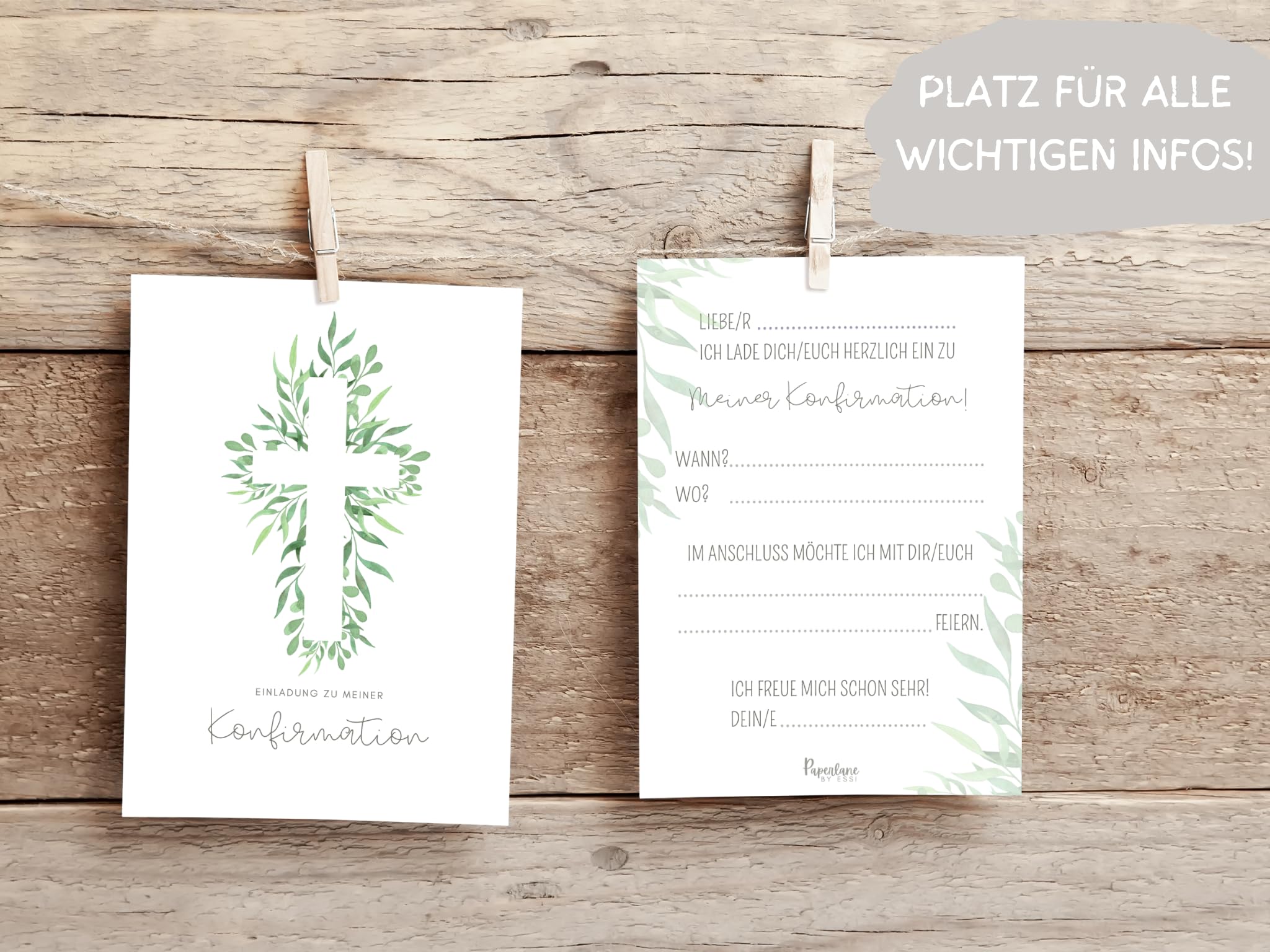 Hey, die Konfirmation deines Kindes steht an? Mit diesen Einladungskarten von Paperlane machst du alles richtig! 10 hochwertige Karten im DIN A6 Format (14,8 x 10,5 cm) mit nem richtig schicken Eukalyptus-Design und floralem Kreuz-Motiv. Sieht total modern und zeitlos aus - genau das Richtige für diesen besonderen Tag! Die Karten sind aus stabilem 260g/m² Chromkarton mit matter Oberfläche, die sich super beschreiben lässt. Auf der Rückseite ist genug Platz für alle Infos zu Ort, Datum und Uhrzeit der Feier. Die passenden Umschläge aus recyceltem Kraftpapier sind gleich mit dabei. Und das Beste: Alles wird in Deutschland produziert - Qualität und Nachhaltigkeit vom Feinsten! Einfach ausfüllen, in die Umschläge stecken und verteilen - schon bist du bereit für die große Feier. Mach die Konfirmation deines Kindes zu nem unvergesslichen Ereignis!